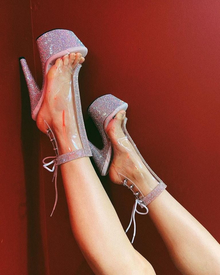 Simply gorgeous 7" (178mm) heel, 2 3/4" (70mm) platform open toe/heel lace-up back ankle boot featuring rhinestone embellishment along center front, ankle opening & platform bottom.