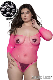 Long-sleeved fishnet teddy with glittering rhinestones all over, an off-the-shoulder neckline and a thong-cut back. (G-string not included)