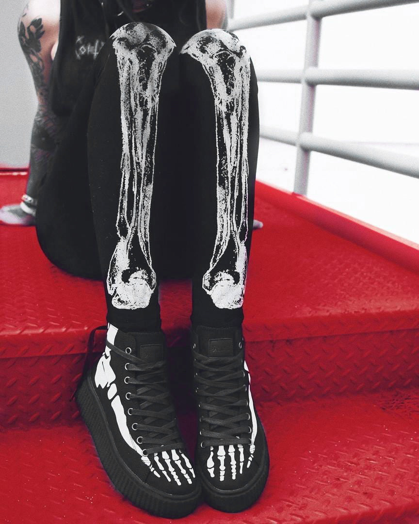 Embrace a fusion of style and comfort with these high-top creeper sneakers featuring a 1 1/2" (38mm) platform and a round toe. The lace-up front, complemented by an X-ray bone print, adds a unique touch, while the full back metal zip closure ensures easy wearability without compromising on style.