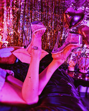 Everyday can be Valentine's Day, with these stunning 7" (178mm) heel, 2 3/4" (70mm) platform ankle strap sandals featuring the platform infused with flowing liquid & floating glitter hearts.
