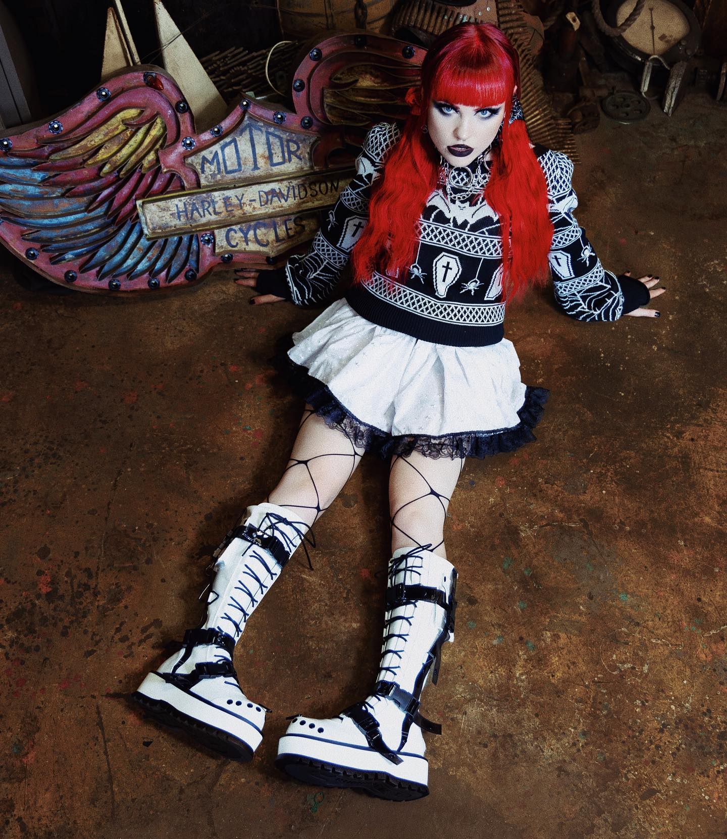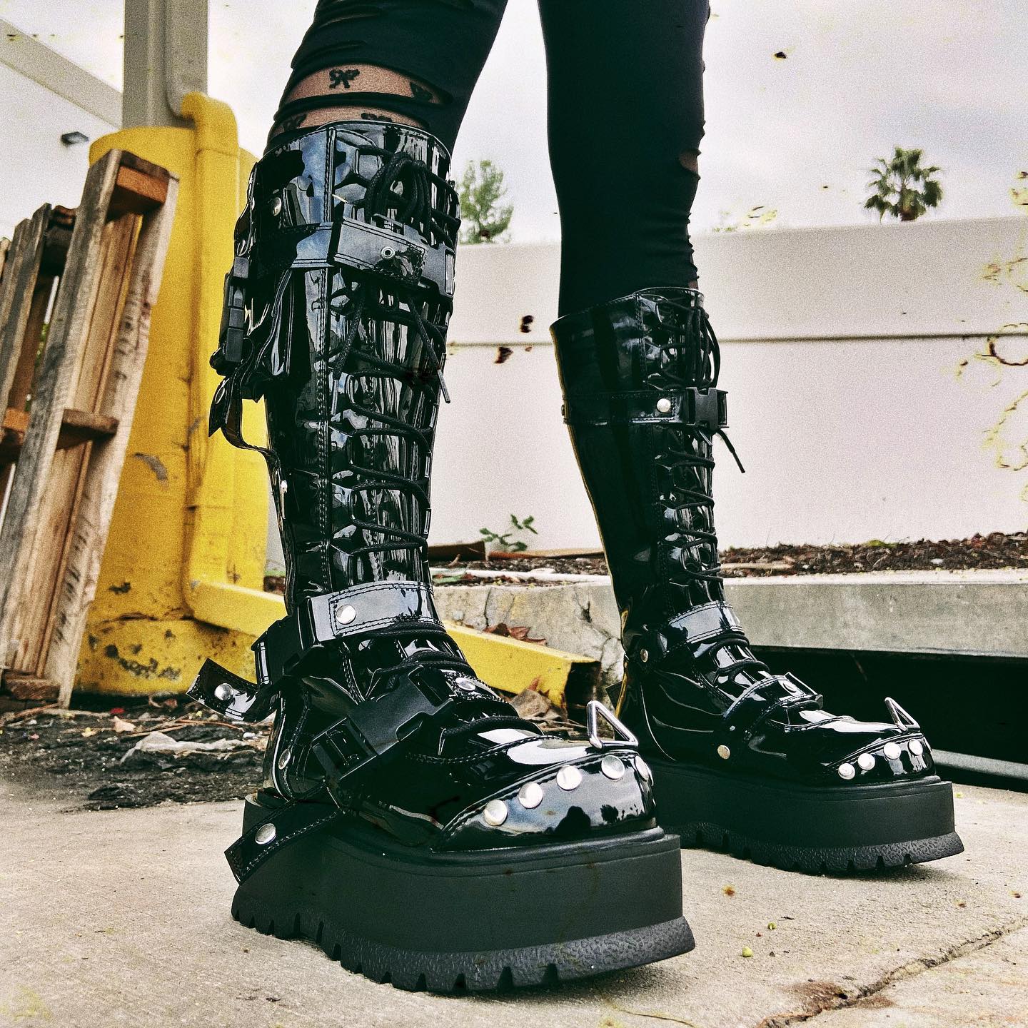 Stomp around in these 2" (51mm) platform lace-up front knee high boot featuring cargo side pocket, quick release plastic buckle straps and studding & triangle ring details with full back metal zip closure.