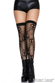 Stretch fishnet stockings with skulls featuring hollow eyes all around and an opaque band.