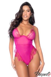 High leg sheer mesh teddy with an eyelash lace trim, ruffles over the hips, underwired cups, elastic boning, adjustable straps, an hook & eye back and crotch closure.