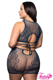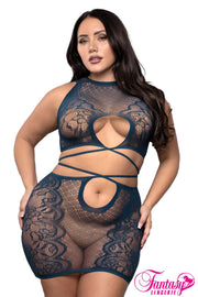 Own the night in this high-neck floral lace top featuring a bold bust cutout, criss-cross underbust straps that tie at the back, and a sleek racerback design. The look comes complete with a high-waisted fitted net skirt, styled with waist cutouts and matching criss-cross tie-back straps for a finish that’s equal parts fierce and flawless.