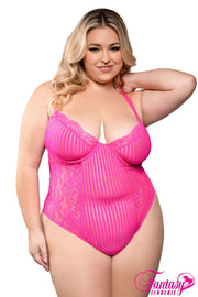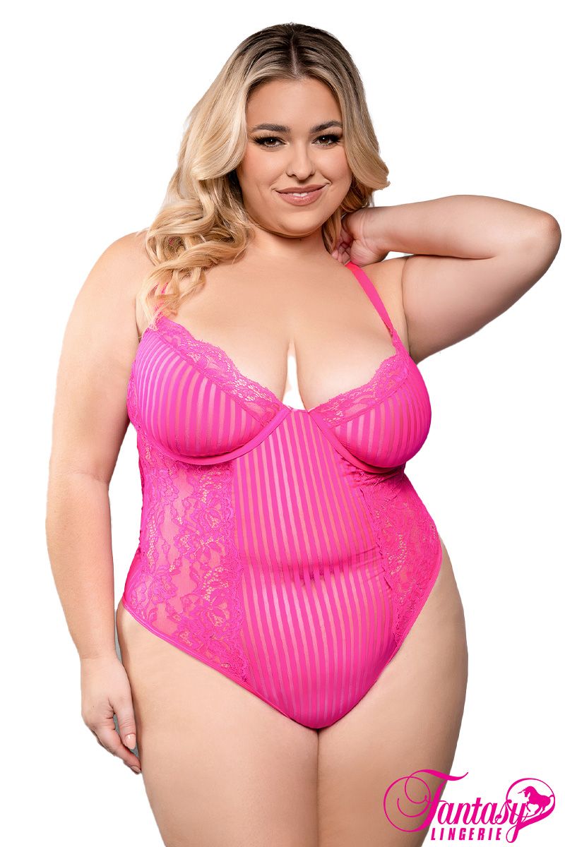 Striped mesh teddy with underwired cups, floral lace over the sides, adjustable straps and an open crotch.