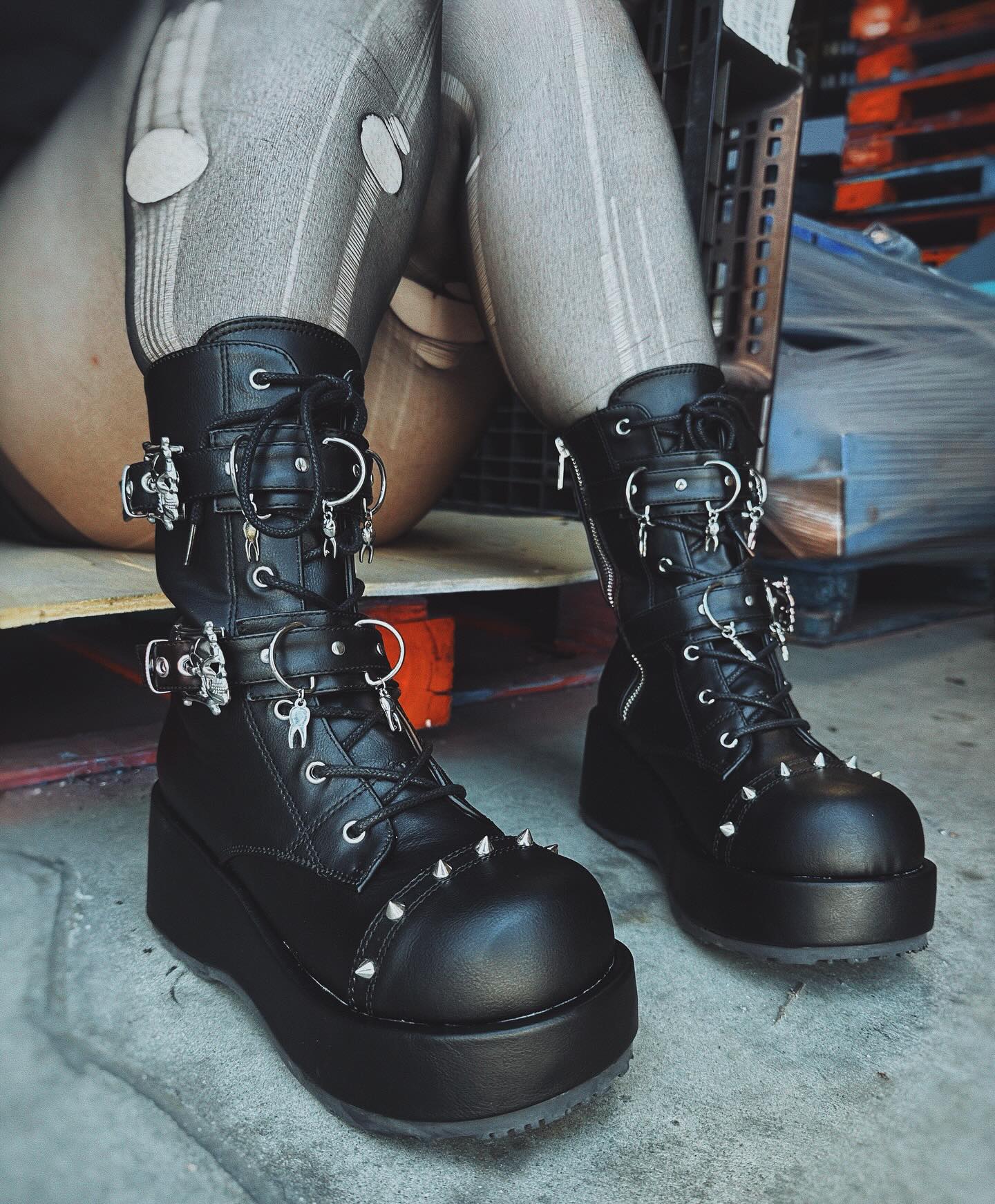 Step into confident style with these platform ankle boots, featuring a 2 3/4" (70mm) heel and a lace-up front for a secure fit. The double skull buckle straps, D-ring with hanging tooth charm, and cone spike studs at the top cap add a touch of rebellious elegance, while the inside metal zip closure ensures easy wear.