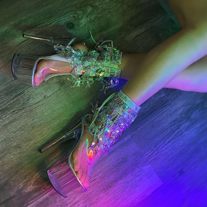7" (17.75cm) Heel, 2 3/4" (7cm) PF Open Toe/Heel Lace-Up Back Ankle Boot Featuring 4-Layer Sequins Fringe, Inside Zip Closure