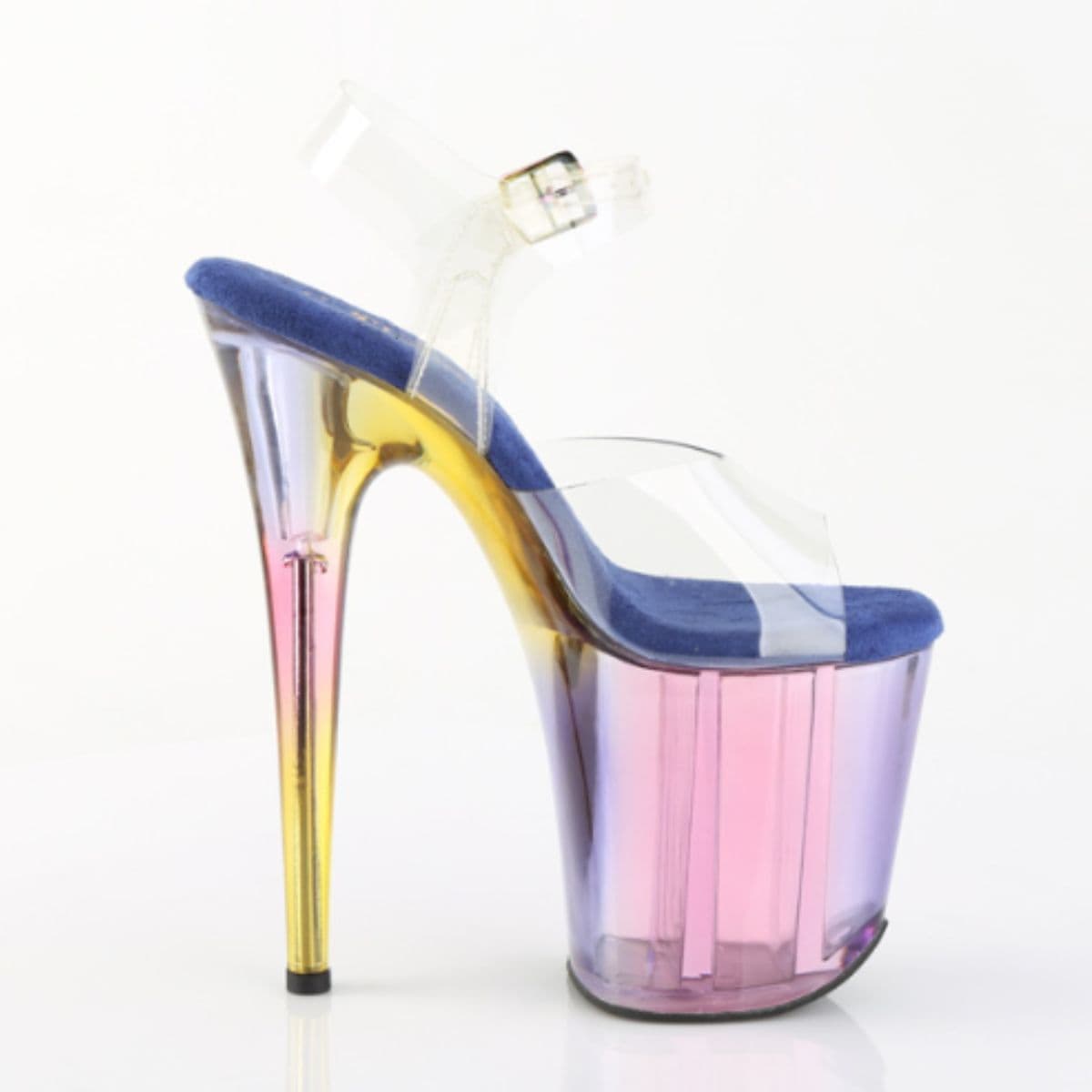 The platform bottom of this 8" (200mm) heel, 4" (100mm) platform ankle strap sandal has a unique holographic tint. The ankle strap provides a secure fit, while the high heel and platform provide extra height. This shoe is perfect for adding a bold statement to any outfit.