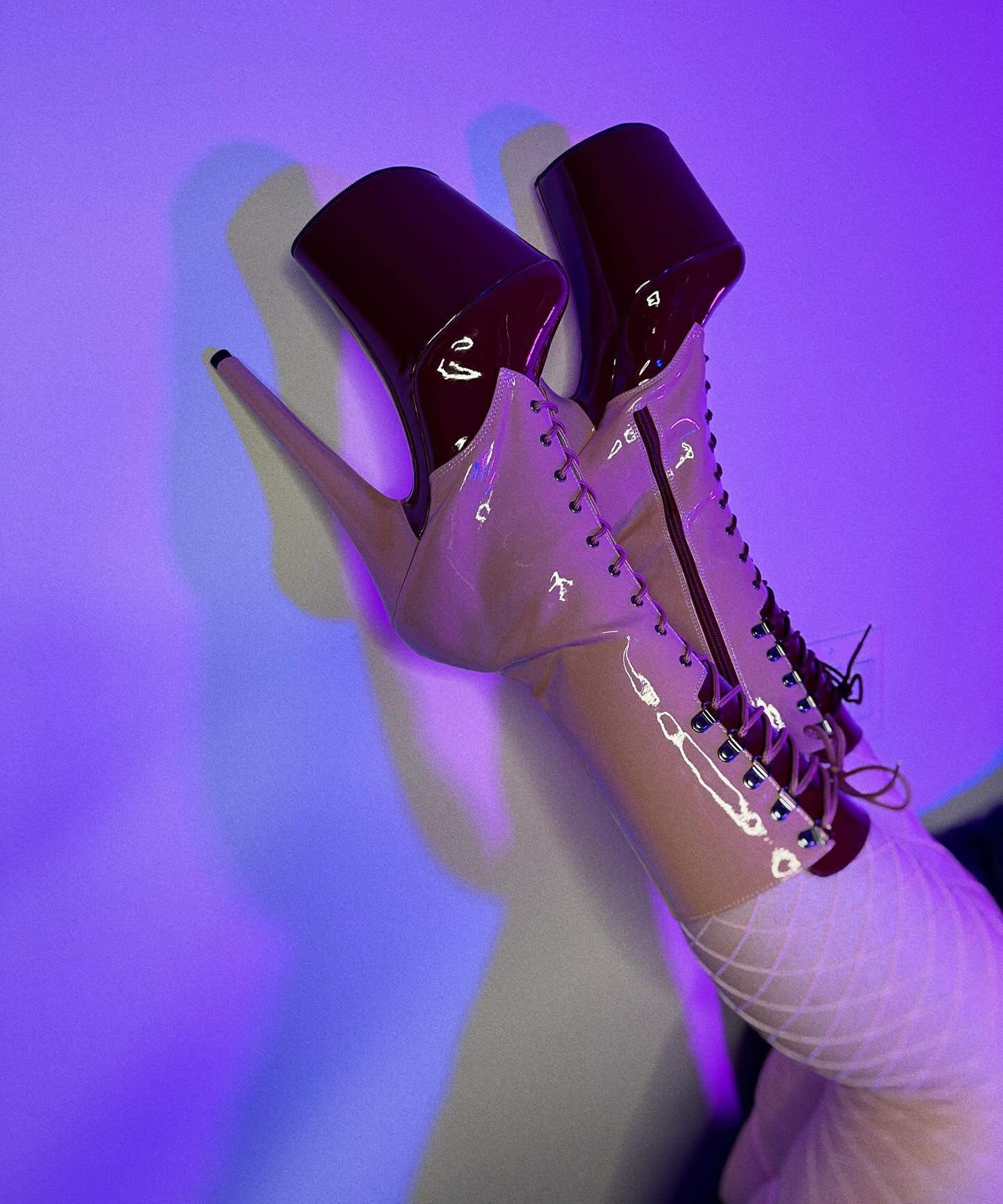 These stunning mid-calf boots, featuring an 8" (200mm) heel and a 4" (100mm) platform. The two-tone lace-up front, fully wrapped platform bottom, and inner side zip closure add a touch of elegance, while the inclusion of two matching shoe laces provides versatility in styling options.
