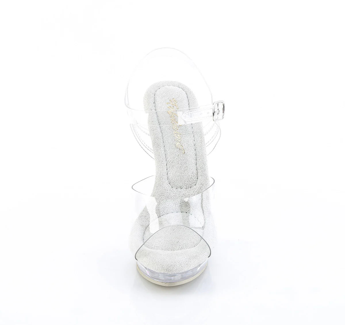 Montrez vos pieds avec transparence pour un look provocateur. Ces sandales toutes transparentes vous aideront à obtenir un look sexy, sans sacrifier votre confort. Elles présentent une large lanière pour les orteils, deux sangles latérales qui soutiennent une sangle à la cheville avec fermeture latérale métallique, des talons transparents assortis de 5 pouces (12,5 cm) et une plateforme transparente avant de 0,75 pouce (2 cm) de hauteur.