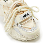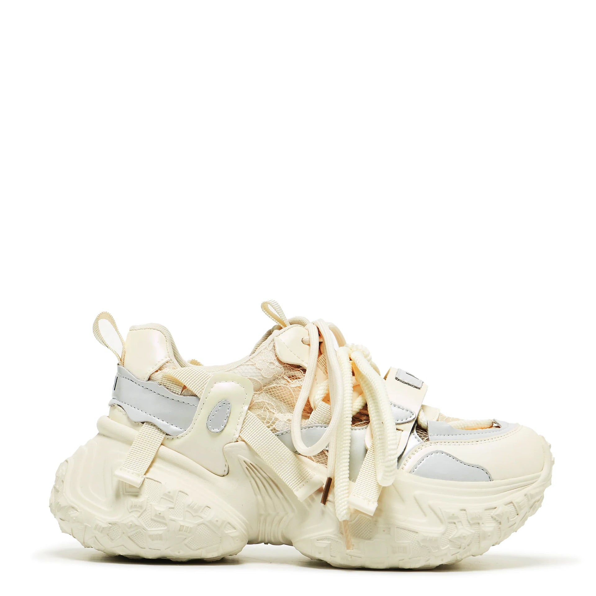 Délicat, avec du mordant. Les Frozen Shores Trainers mélangent des tons ivoire doux et de la dentelle transparente avec des semelles méga épaisses conçues pour piétiner dans des dimensions oniriques. Enveloppés de doubles lacets et de textures superposées, ils sont à la fois contes de fées et prêts pour l’avenir.