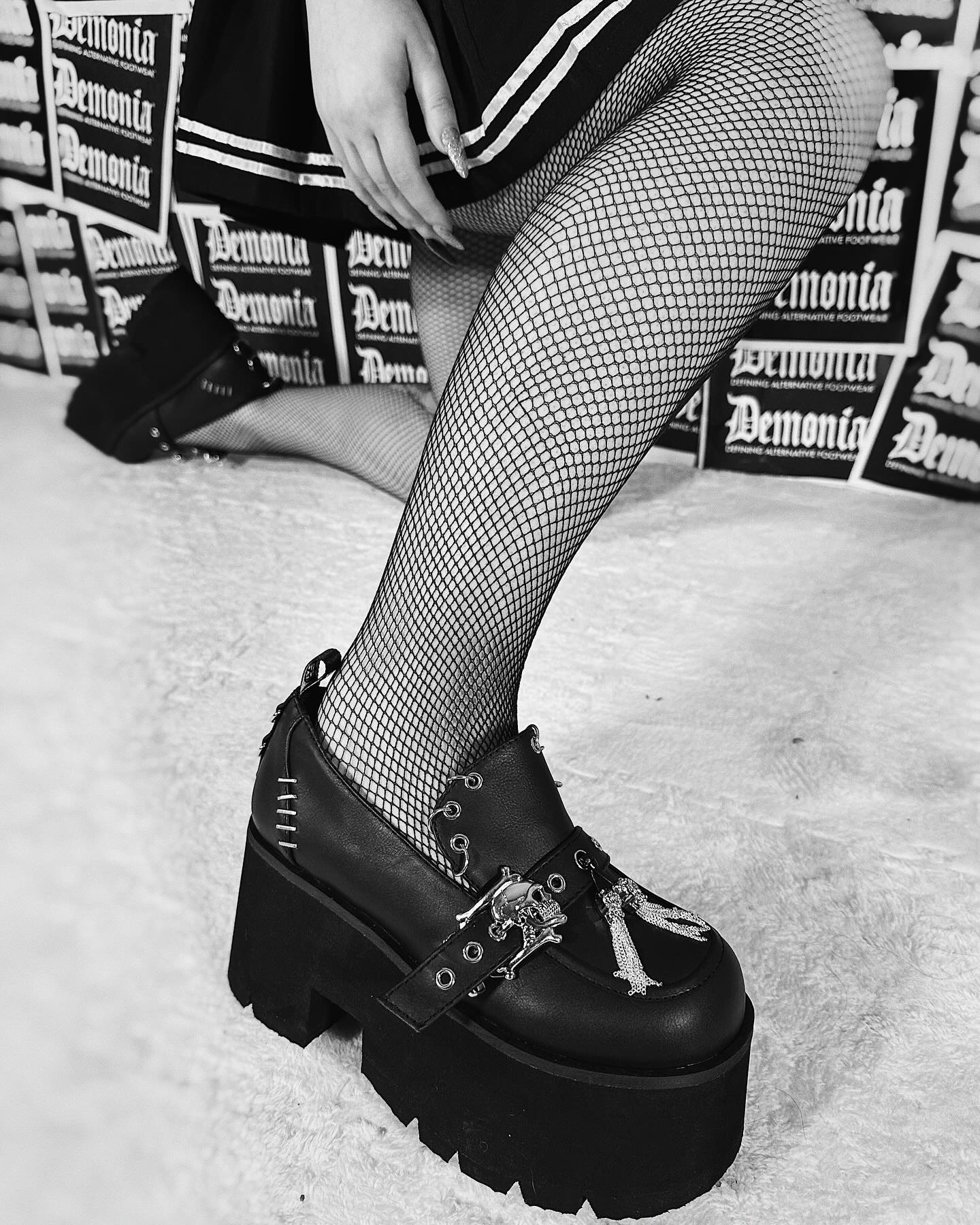 Ce mocassin est doté d’un talon épais de 3 1/2 po et d’une plateforme découpée de 2 1/4 po pour un style audacieux. Il est orné d’une languette percée à un joint torique en métal, d’une sangle à boucle crâne, de pompons en chaîne et d’accents de clous et de joints toriques sur le talon pour un look unique et avant-gardiste.