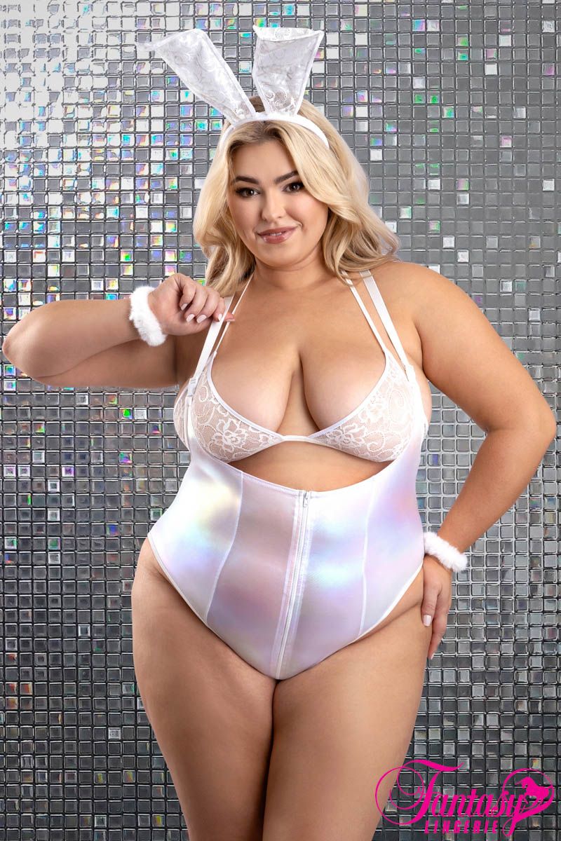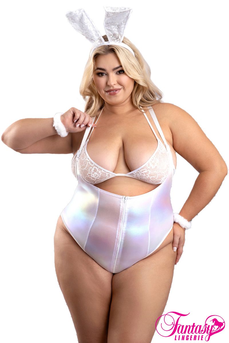 Ce teddy iridescent brillant possède une poitrine complètement ouverte, des sangles ajustables, une découpe arrière en forme de losange avec une queue de lapin détachable, ainsi qu’une fermeture éclair de l’avant vers l’arrière. Il comprend un bralette en dentelle douce avec un col dos nu et une sangle arrière ajustable, des brassards moelleux et un bandeau en dentelle façon oreilles de lapin.