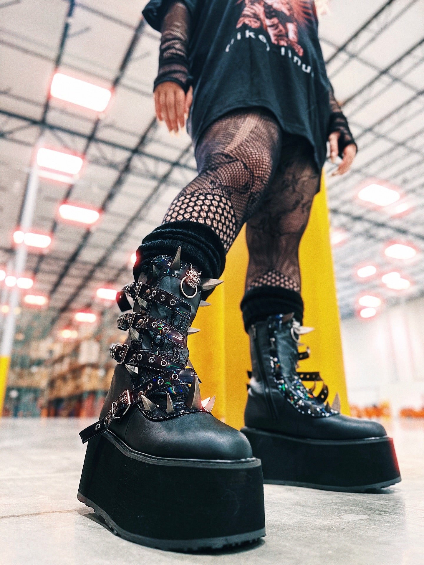 Libérez votre enfer intérieur avec ces bottes à plateforme féroces à mi-mollet. Dressés sur une plateforme audacieuse de 3 1/2" (90 mm), ils présentent un bouclier frontal ceinturé avec un design de flamme à fort contraste qui augmente la chaleur. Des pointes en forme de griffe en acier de canon, des sangles ornementales et un détail en forme de joint torique diabolique sur la langue apportent une attitude sérieuse. Finition avec une fermeture éclair intérieure en métal élégante pour faciliter le posage et le détachement.