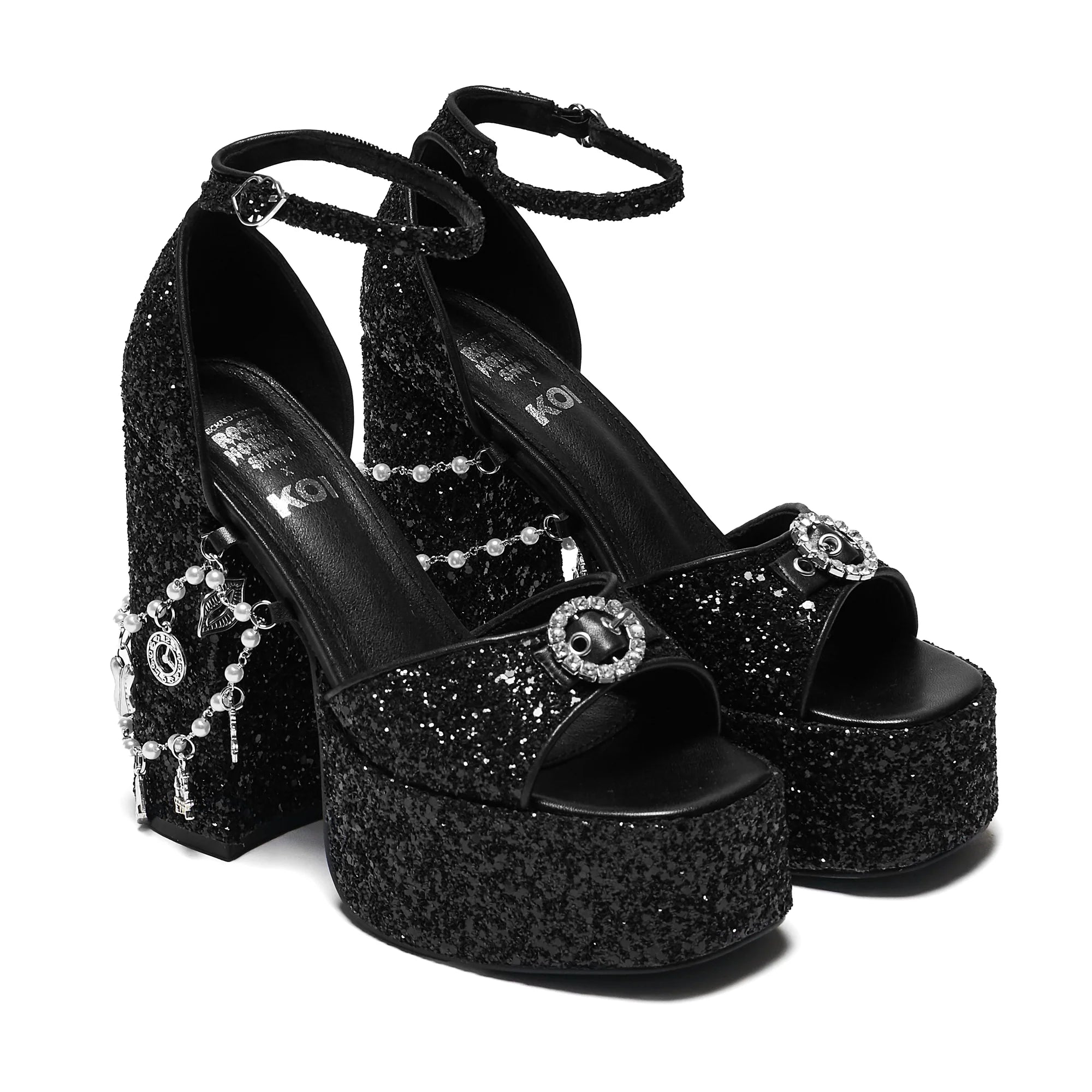 Osez rêver grand avec ces talons, un hommage étincelant au Rocky Horror Show. Une nouvelle version des talons que Frank N Furter porte sur scène – c’est Frank avec une touche de charme KOI! Ces beautés à bout ouvert sont dotées d’une finition scintillante noire élégante qui vous fera frissonner d’anticipation... ation. Associés à un talon bloc imposant et à une plateforme pour un drame ultime, ils ont des chaînes charmées perlées glamour drapées le long du talon. Ornés d’icônes sur le thème de Rocky Horror, notamment des lèvres, un corset, une horloge, un château, une moto et une chaussure, ils capturent l’essence des moments inoubliables du film. Parfaits pour faire une déclaration éblouissante n’importe où, ces talons sont un incontournable pour tout fan de Frankie.