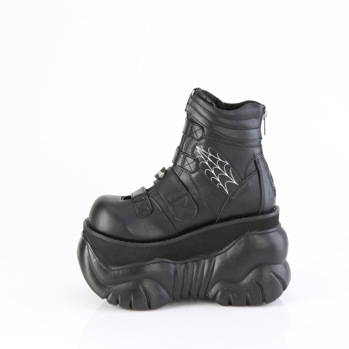 Entrez dans un style avant-gardiste avec ces bottines à plateforme de 3 po (76 mm), dotées de bretelles avant ornementales, d’un col rembourré et de panneaux latéraux en toile d’araignée finement brodés. La fermeture à glissière en métal à l’arrière assure à la fois le confort et un look audacieux pour toutes les occasions.