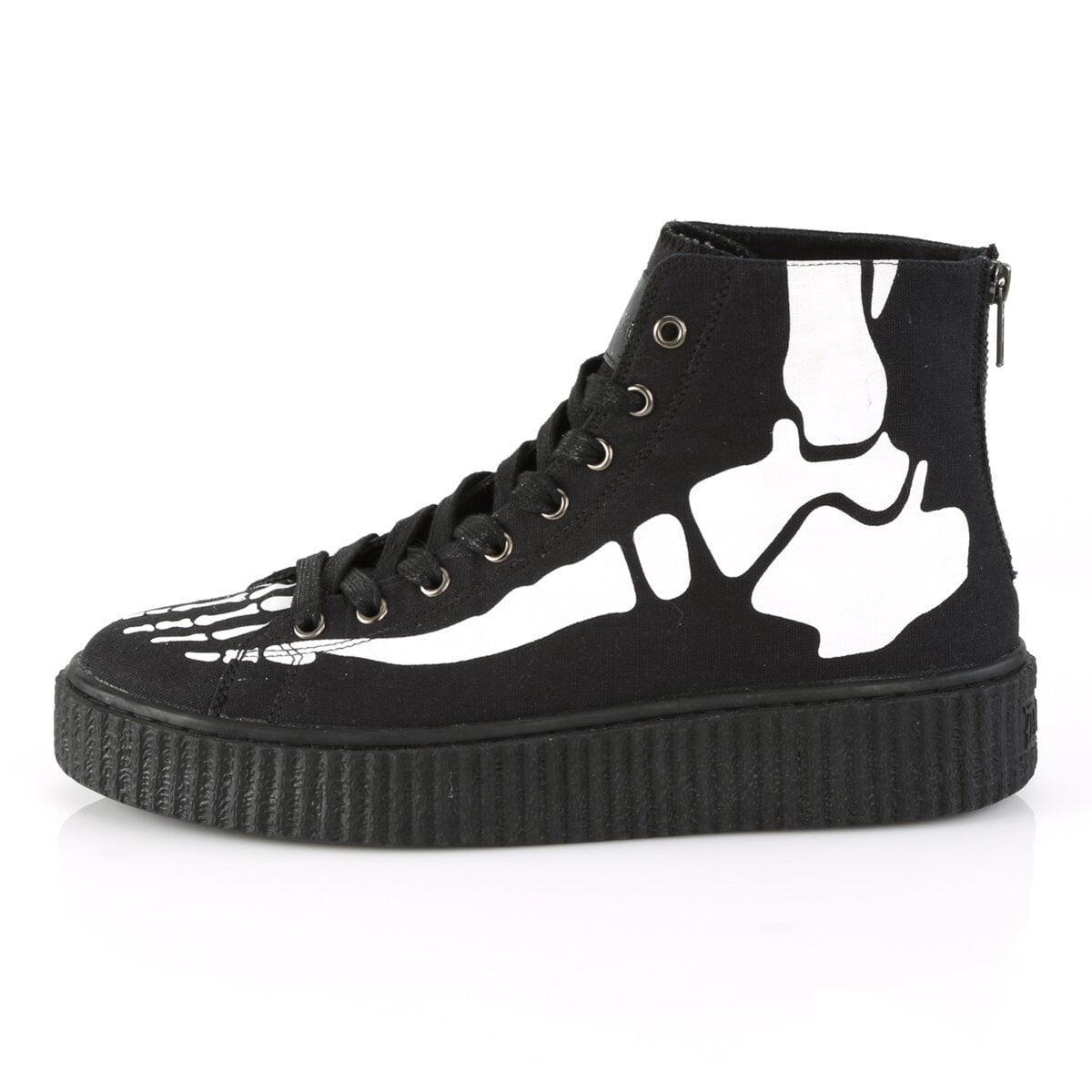 Adoptez une fusion de style et de confort avec ces baskets creeper à canon montant, dotées d’une plateforme de 1 1/2" (38 mm) et d’un bout rond. L’avant lacé, complété par un imprimé os à rayons X, ajoute une touche unique, tandis que la fermeture éclair métallique dans tout le dos assure une portée facile sans compromettre le style.