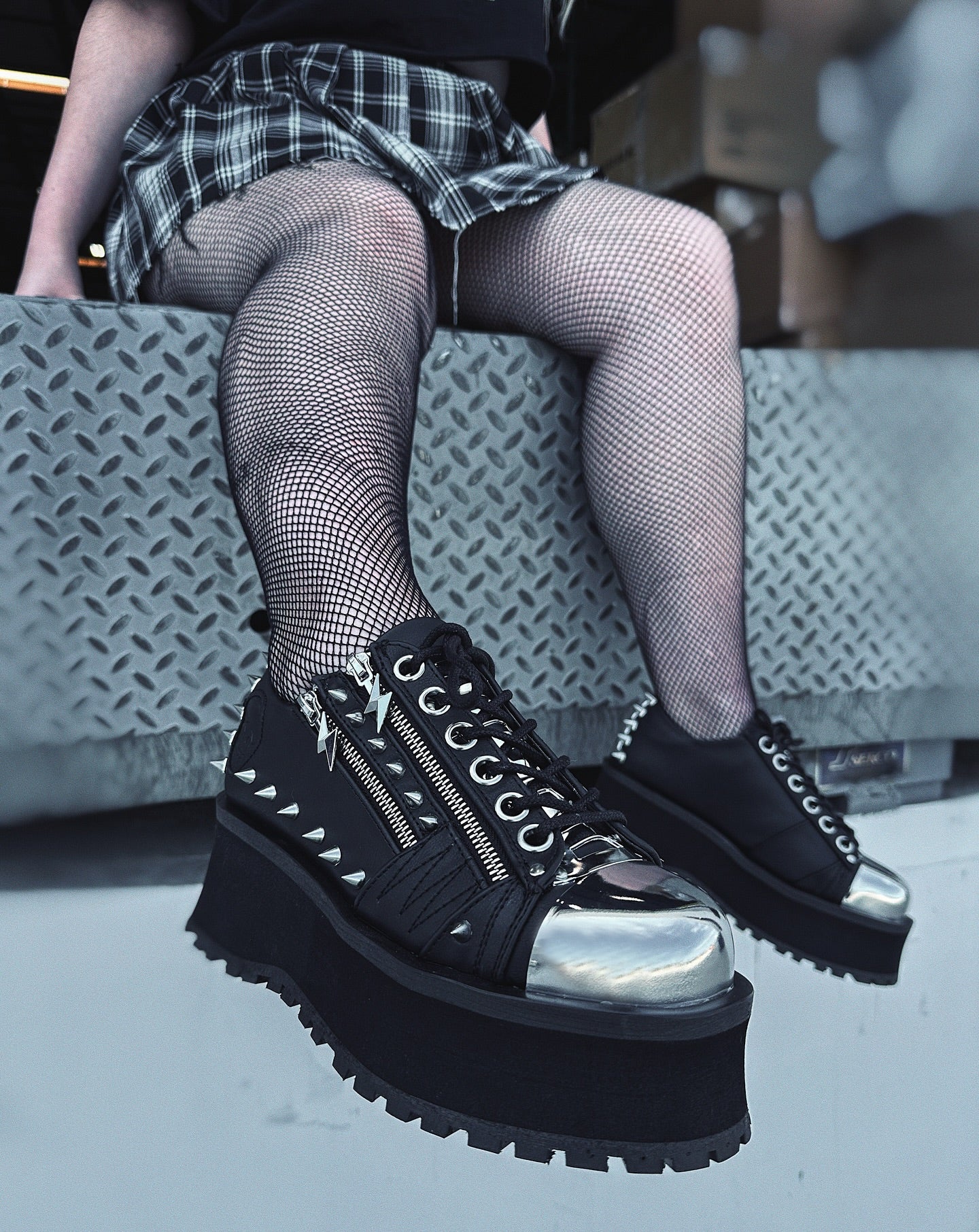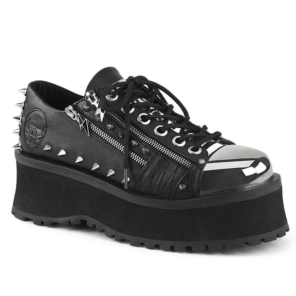 Plateforme originale et audacieuse de 2 3/4" (70 mm) en métal chromé argenté, Oxford à lacets avec double fermeture éclair métallique ornementale et tête de fermeture éclair, plaques en forme de pyramide sur le talon et la languette, détails de clous coniques, et crâne embossé sur le talon extérieur.