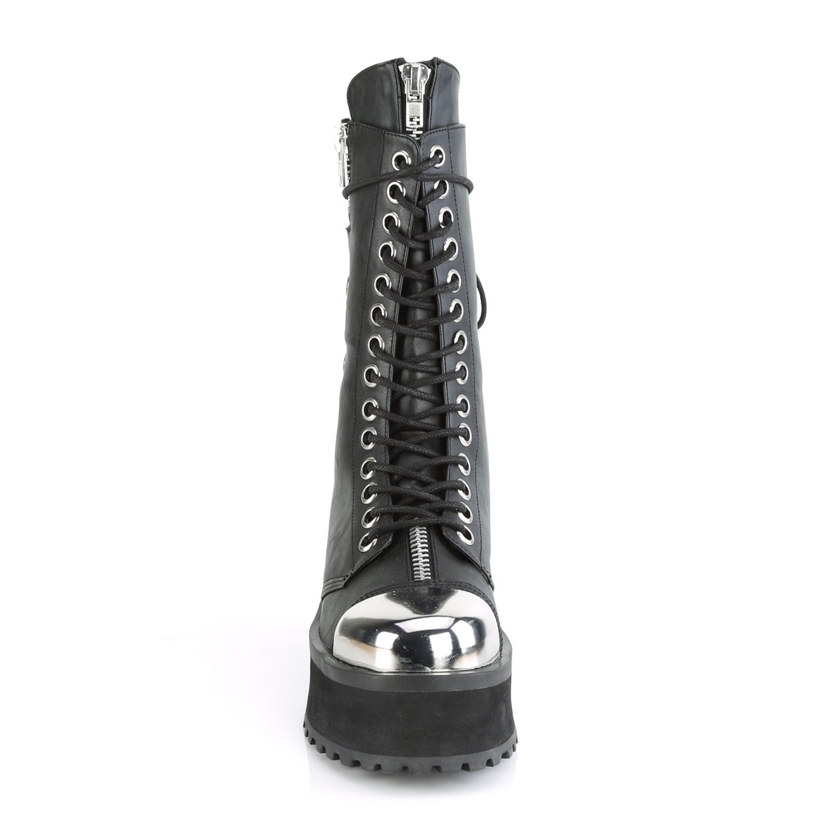 Botte à plateforme audacieuse de 2 3/4" (70 mm) à lacets à mi-mollet, avec embout métallique argenté chromé et détails ornementalement de fermeture éclair sur la languette et le côté extérieur, fermeture arrière métallique.