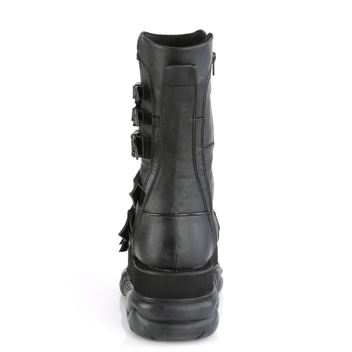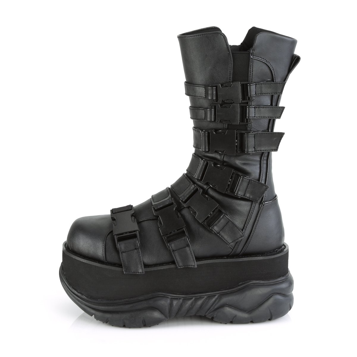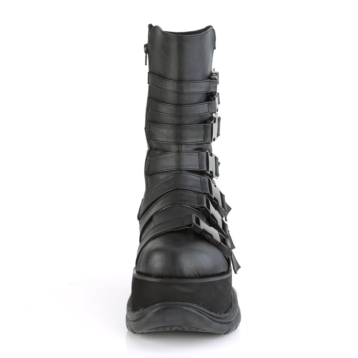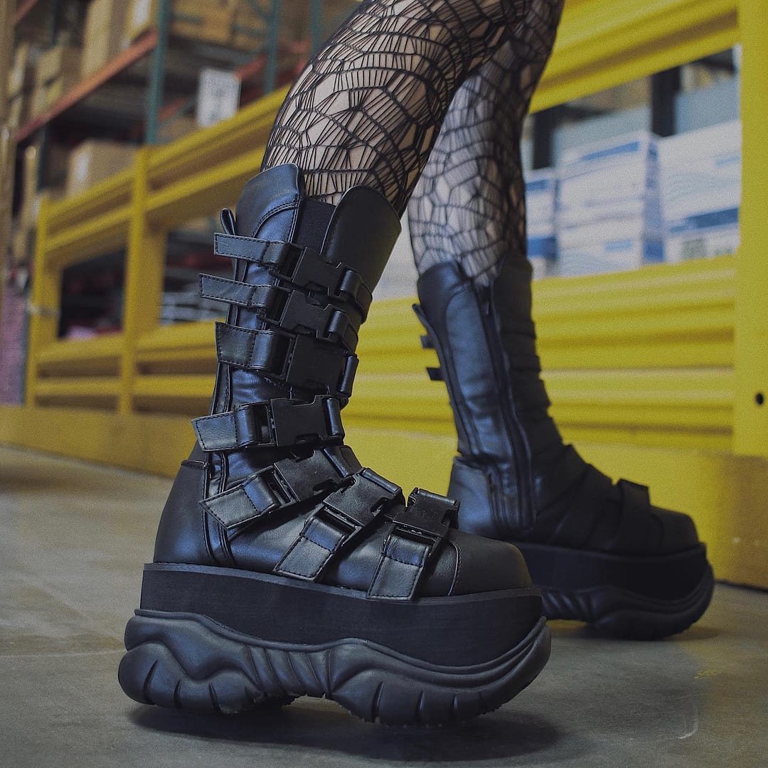 Botte à plateforme funky de 3" (76 mm) au milieu du mollet avec gousset latéral extérieur et multi-sangles avec boucles en plastique à dégagement rapide latérales, fermeture éclair intérieure.