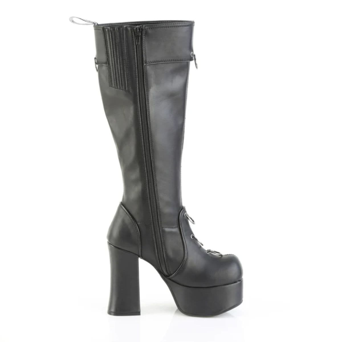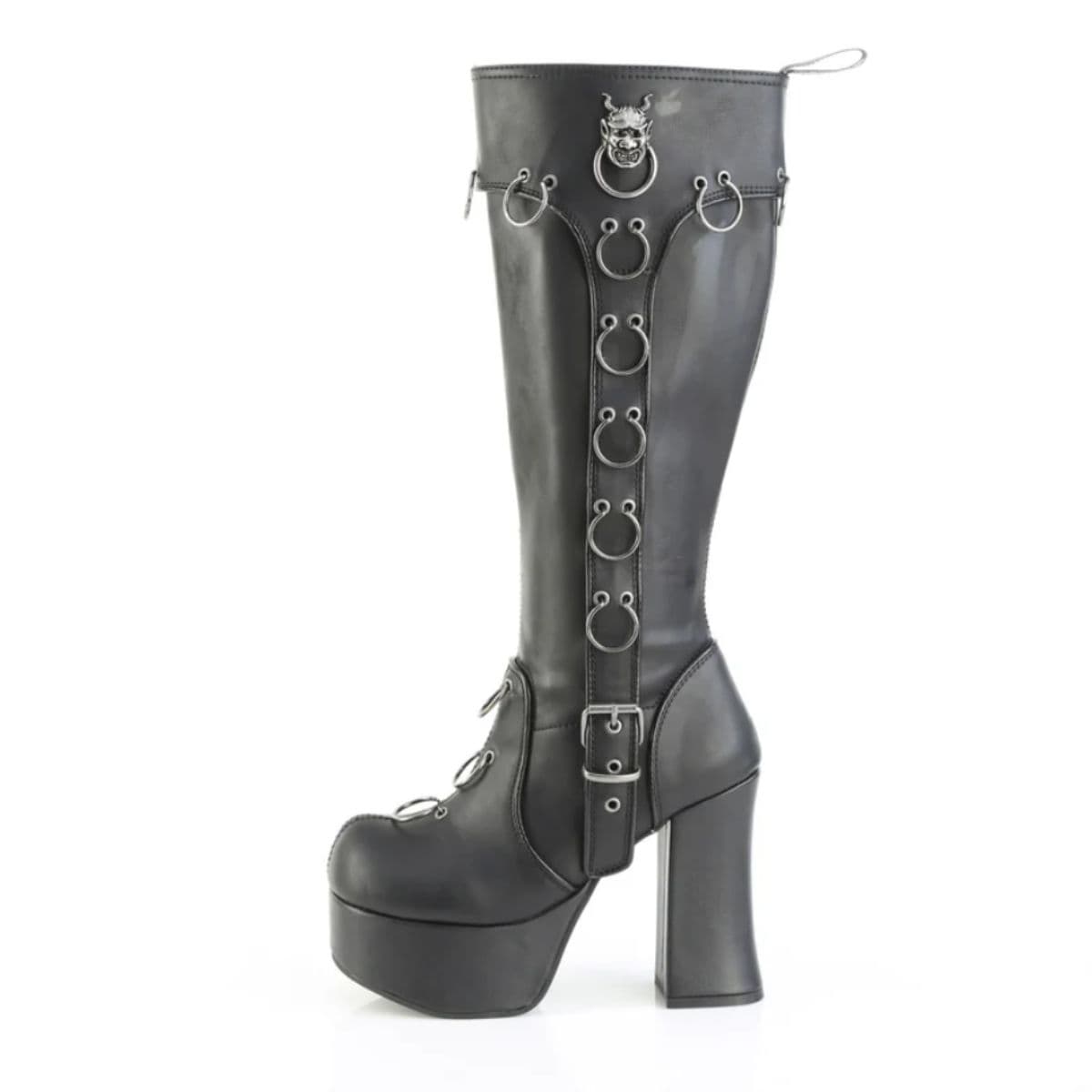 Faites une déclaration audacieuse avec ces bottes montantes au genou avec un talon bloc de 4 1/2 » (114 mm) et une plateforme de 2 » (51 mm ), avec une tige en O percée et un détail de boucle accrocheur. Fini avec un pendentif en métal devil et une fermeture éclair intérieure latérale pour un port facile, ils sont le parfait mélange de style audacieux et cool.