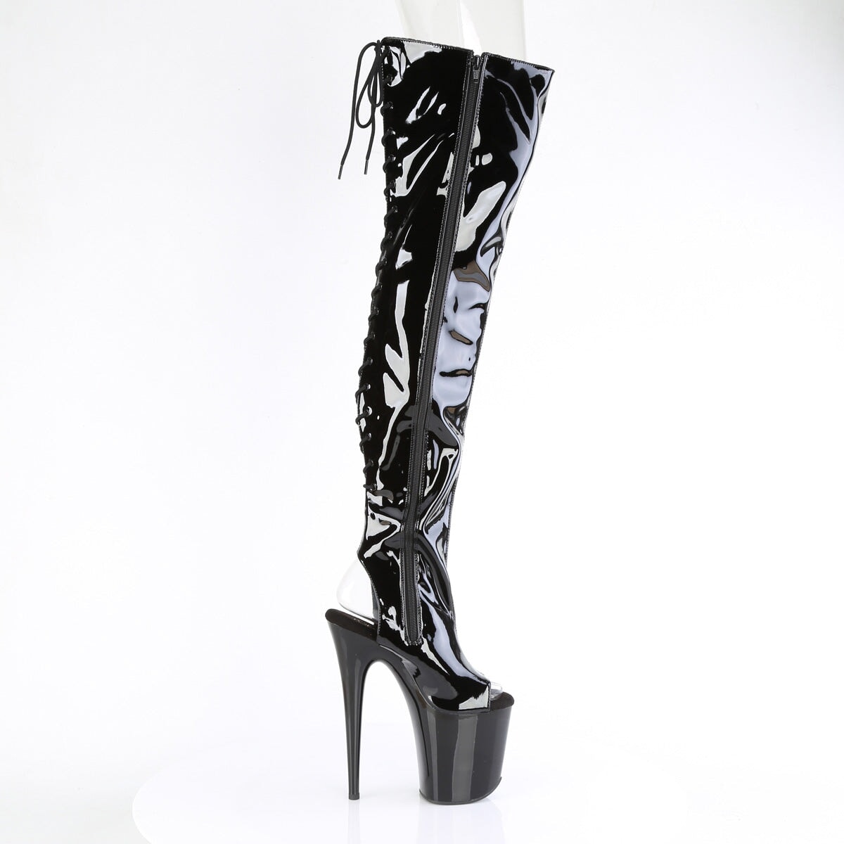 Reflétez votre démarche la plus sexy avec cette botte à talons ouverts de 8 » (200 mm), 4 » (100 mm), à plateforme, à pointe ouverte/talons remontés dans le dos, à hauteur de cuisse, fermeture éclair intérieure complète.