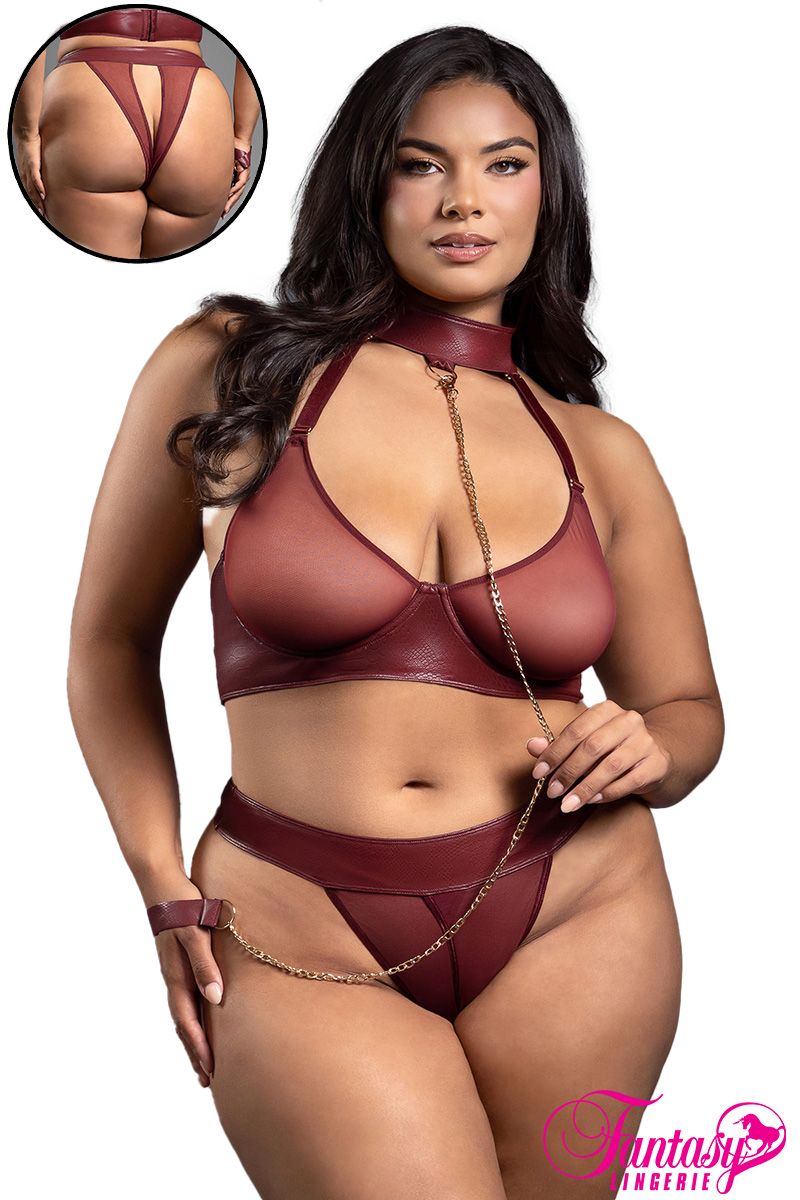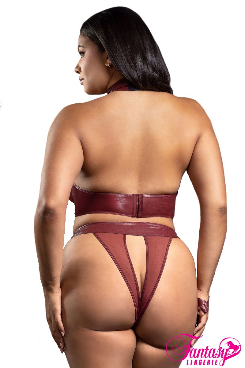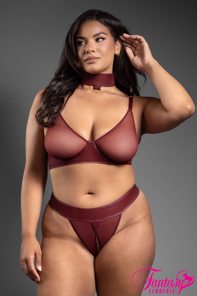 Soutien-gorge en simili cuir brillant avec bonnets en maille transparente à armatures, avec des sangles amovibles et ajustables attachées à un collier en laisse, des sangles réglables et une fermeture à crochet et œillet. String en maille transparente avec une ceinture épaisse et mouillée, un entrejambe ouvert et une fente ouverte.