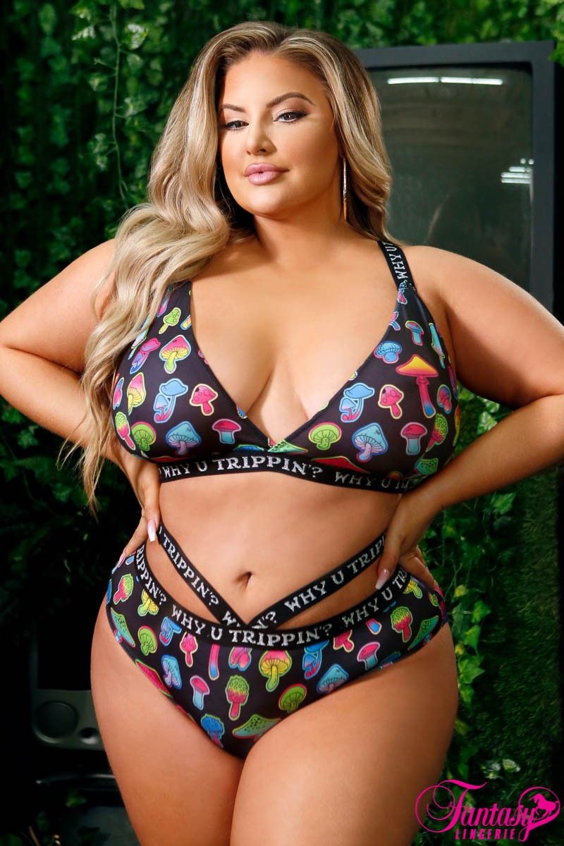 Bralette en forme de champignons arc-en-ciel, vibrante et ludique, avec une culotte à brides épaisses et ajustables en élastique de dos de course avec un imprimé « POURQUOI TRÉBUCHER? » et une fermeture à crochet et œil. La culotte assortie arbore une double ceinture élastique avec le même imprimé « POURQUOI TU TRIPPIN? » et un gousset en coton doublé, créant un ensemble cohérent et stylé. Parfait pour ceux qui recherchent un ajout unique et amusant à leur collection de lingerie, cet ensemble vous fera sentir confiant et renforcé.