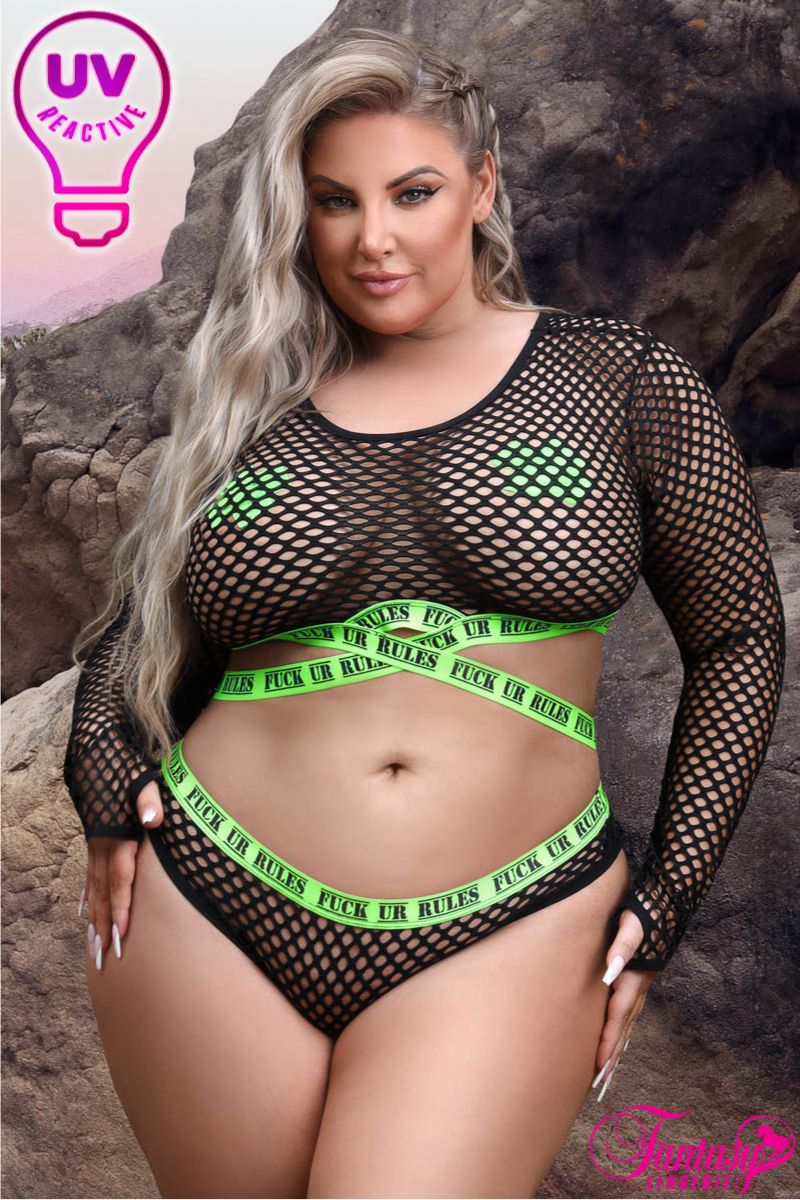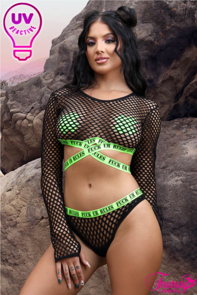 Présentez-vous avec ce haut résille audacieux et audacieux à manches longues et un ensemble de culottes résille assorties, avec un décolleté large à décolleté rond, de larges bretelles élastiques croisées sous la poitrine, et un imprimé « FUCK UR RULES ». L’ensemble comprend aussi deux pâtisseries vertes vertes réactives aux UV, parfaites pour ajouter une touche de plaisir et de flirt à votre look. Parfait pour ceux qui recherchent un ajout unique et audacieux à leur collection de lingerie, cet ensemble saura vous faire sentir confiant et en forme.