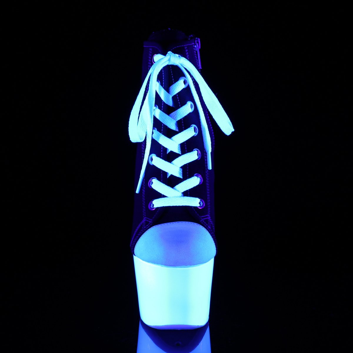 Espadrille en toile amusante et sexy à talon de 7 po (178 mm), à lacets plateformes de 2 3/4 po (70 mm) à l’avant avec fond plateforme réactif à la lumière noire, semelle extérieure et fermeture à glissière intérieure entièrement liftée.