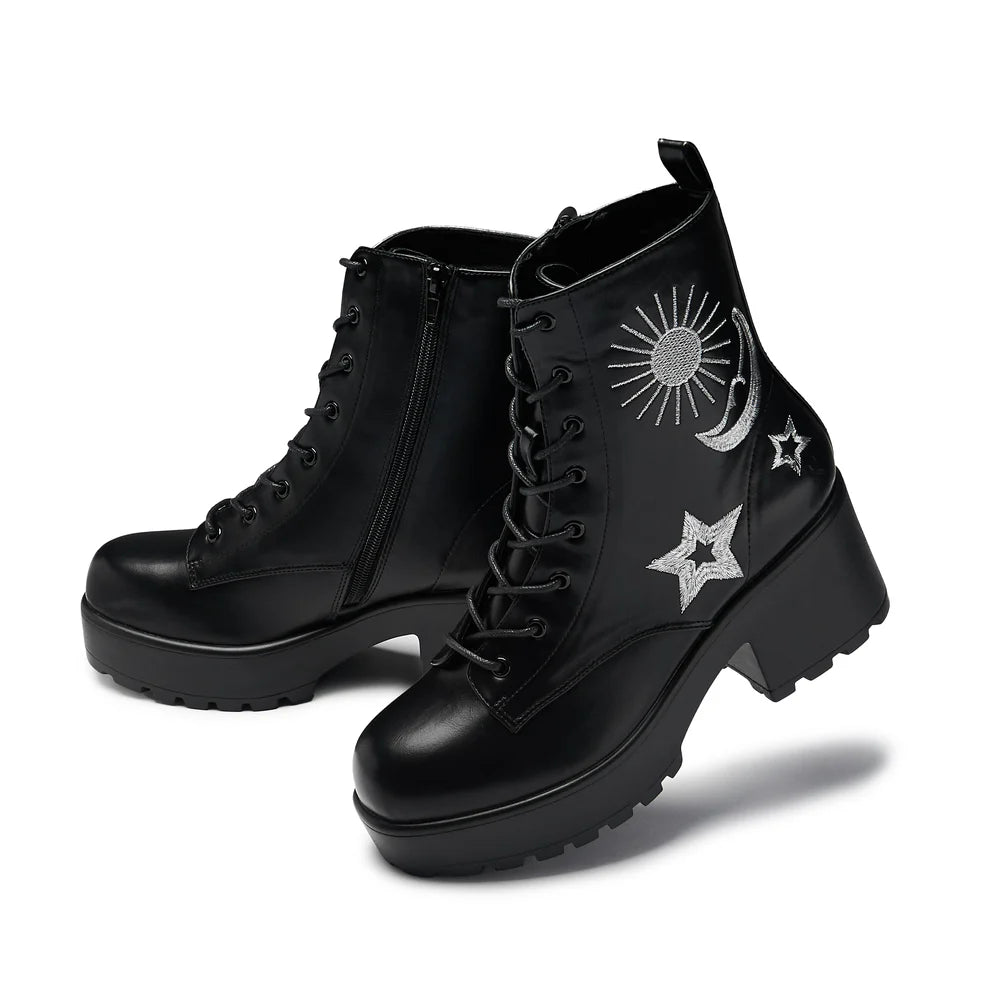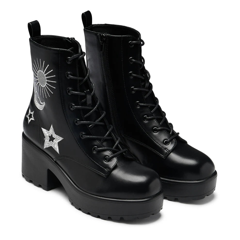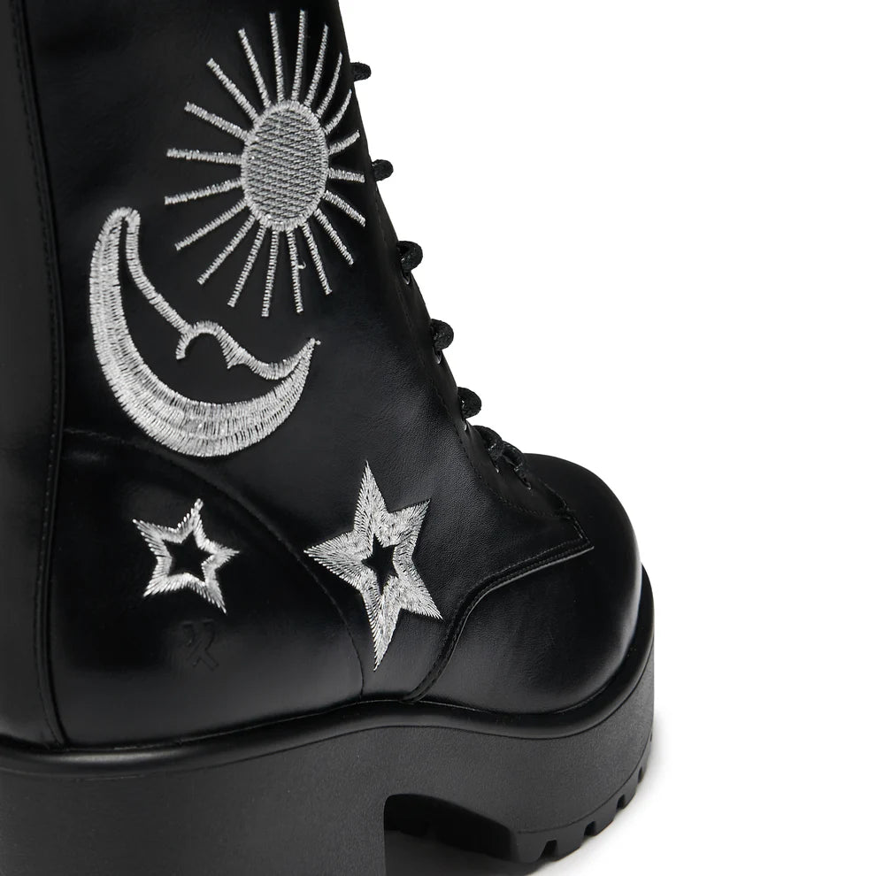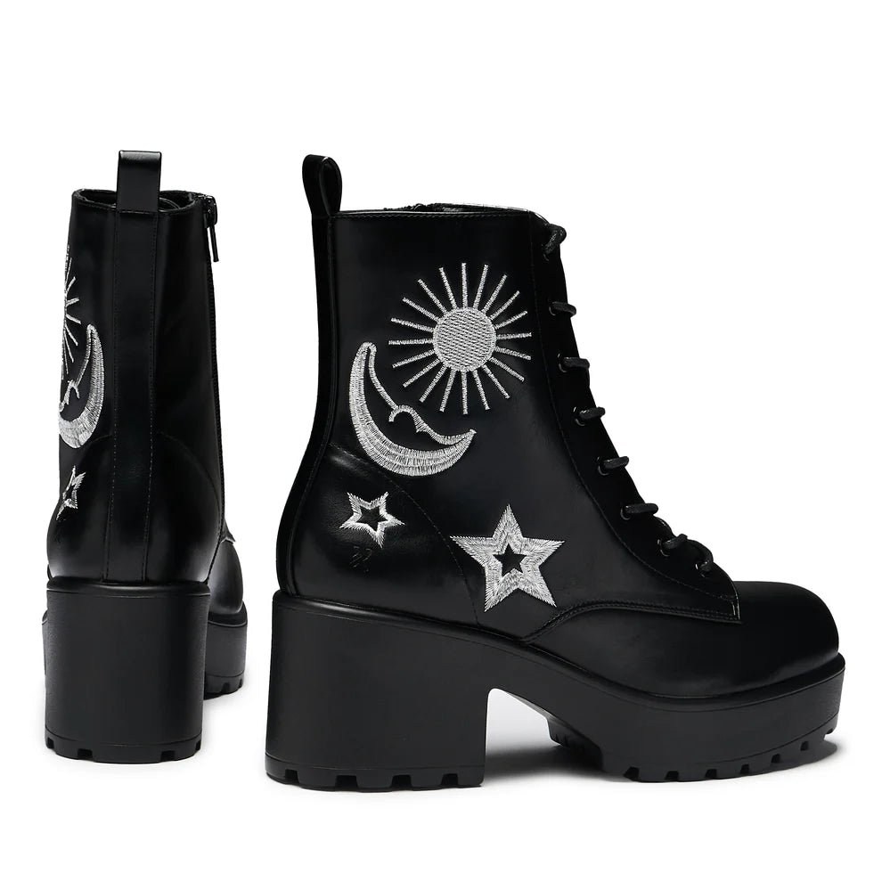 Bottes à plateforme signature Koi + ambiance Wicca = BOTTES ÉPIQUES! Grâce à la polyvalence de ces bottes de motard à plateforme massives, les associer à la plupart des tenues ne sera pas un problème! La lune argentée et les étoiles sur les côtés portent ces bottes à un tout autre niveau.