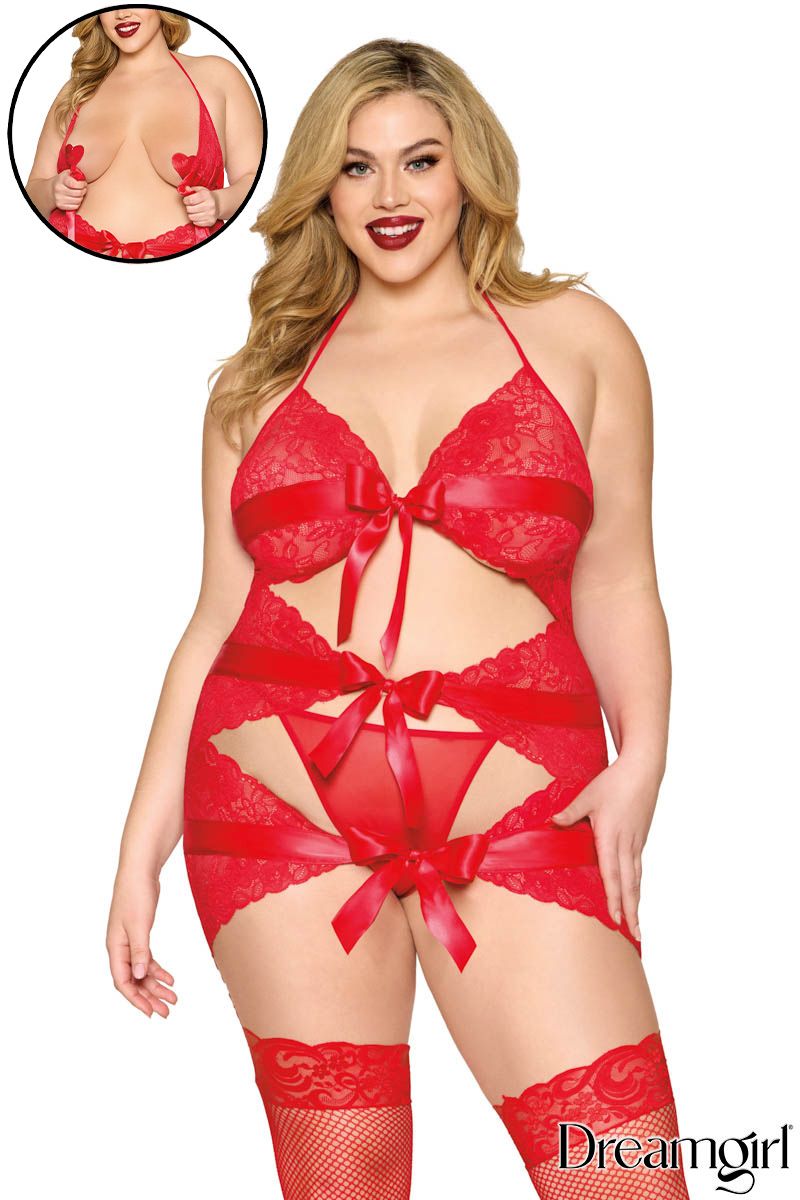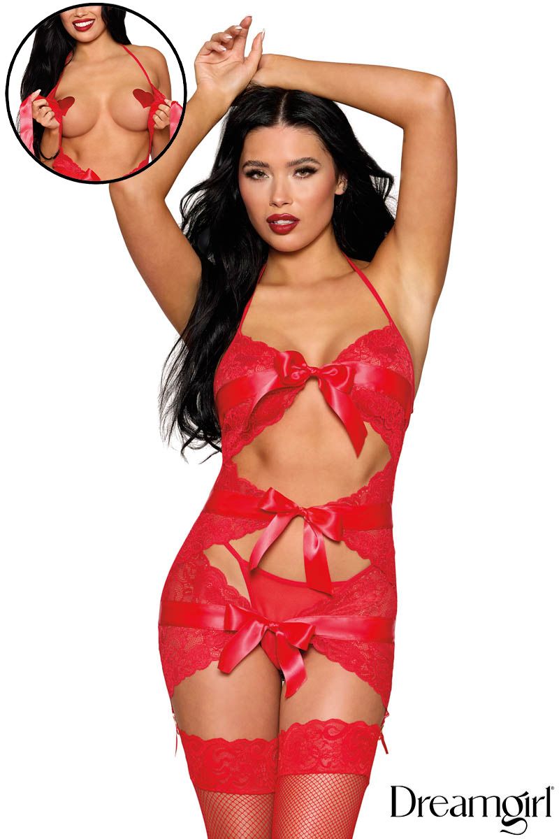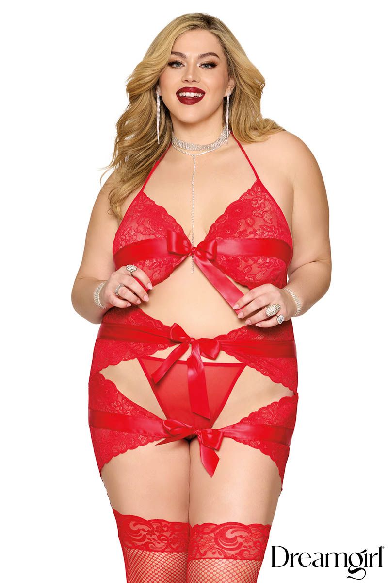 Jarretière en dentelle stretch avec col à col attaché, bonnets doux, large encolure décorée de grands nœuds ajustables, mini-jarretières attachées et 3 bretelles arrière ajustables sur un dos filet extensible et plongeant. (String filet assorti inclus)