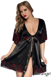 Silky satin robe with a wide mesh trim featuring a satin cherry blossom overlay, 3/4 sleeves and a tie-front closure over the bust. (Panty not included)