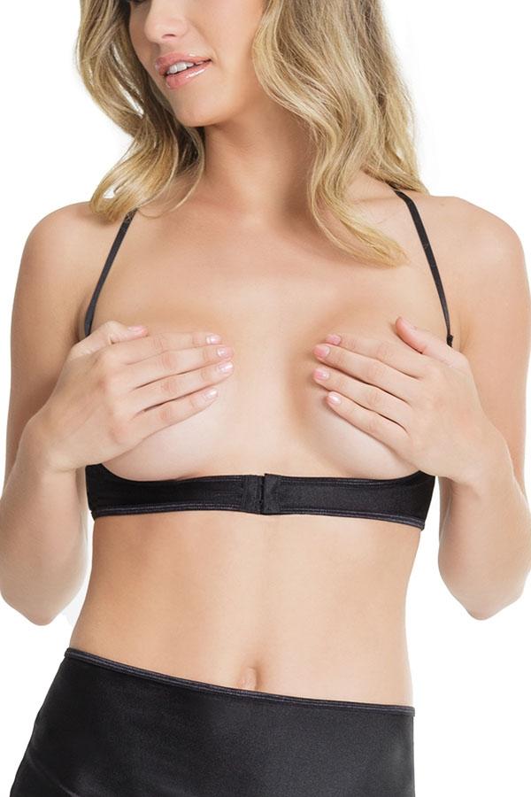 Design de soutien-gorge sans bonnet en tricot extensible et coquin, crochet et fermeture des yeux au centre. Ça peut être porté de deux façons. Dos en T réglable.