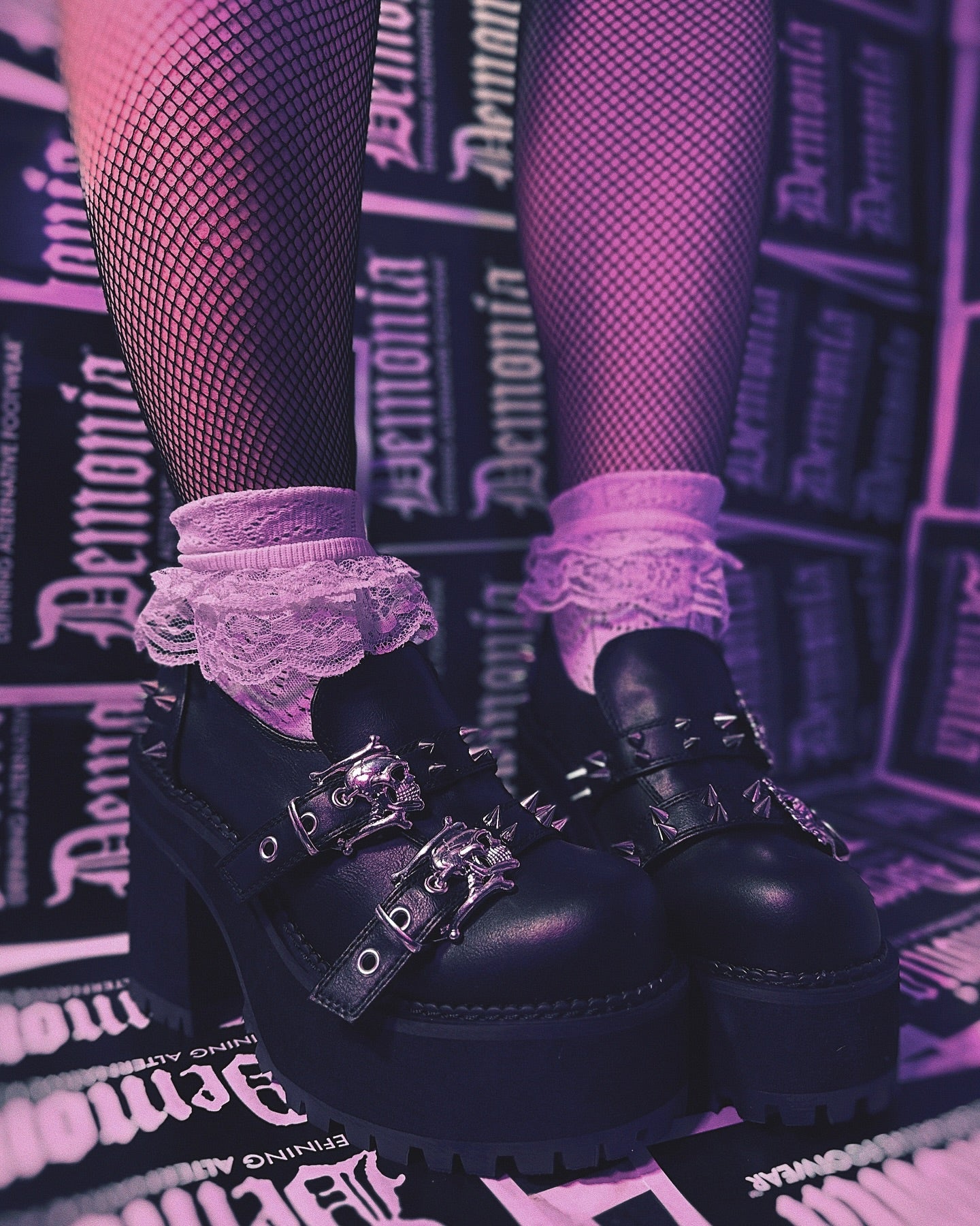 Entrez dans la sophistication avec ces mocassins professionnels, dotés d’un talon bloc de 4 3/4 po (121 mm) et d’une plateforme à crampons de 2 1/4 po (57 mm). Les brides à double boucle crâne et les détails de clous à pointes coniques sur les sangles et le talon ajoutent une touche d’élégance unique pour compléter votre look raffiné.