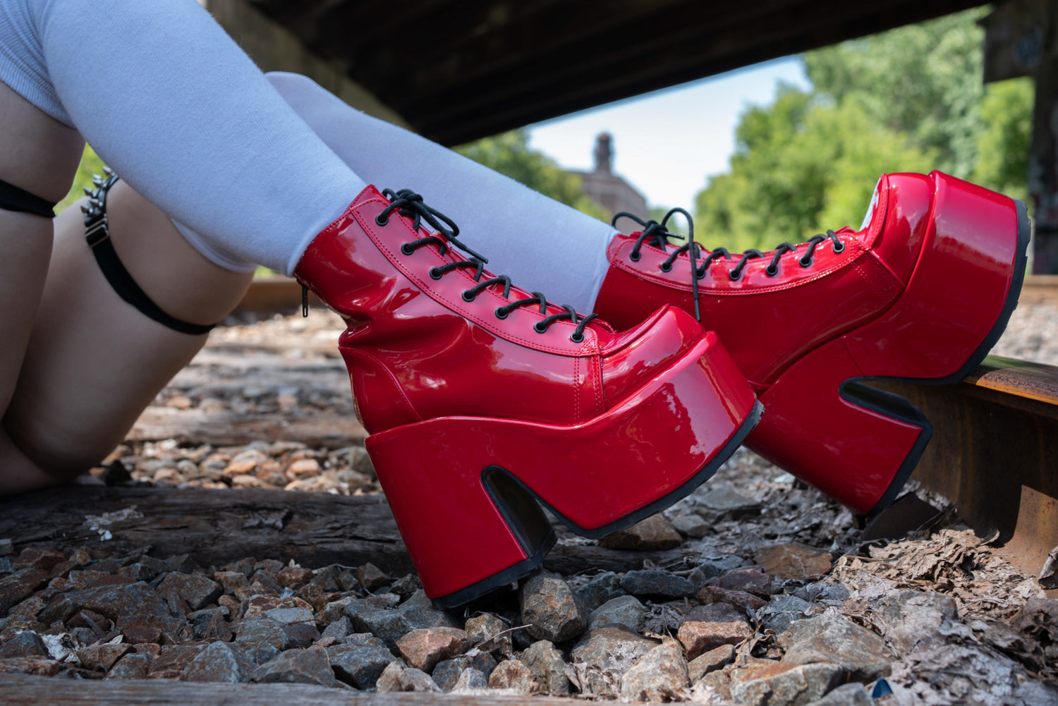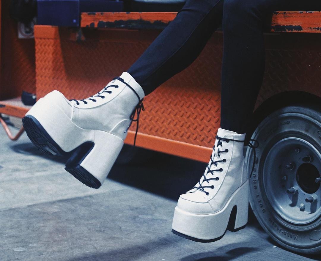 Bottines à lacets à plateforme de 5" (127 mm) à talon et de 3 po (75 mm) avec fermeture à glissière arrière en métal.