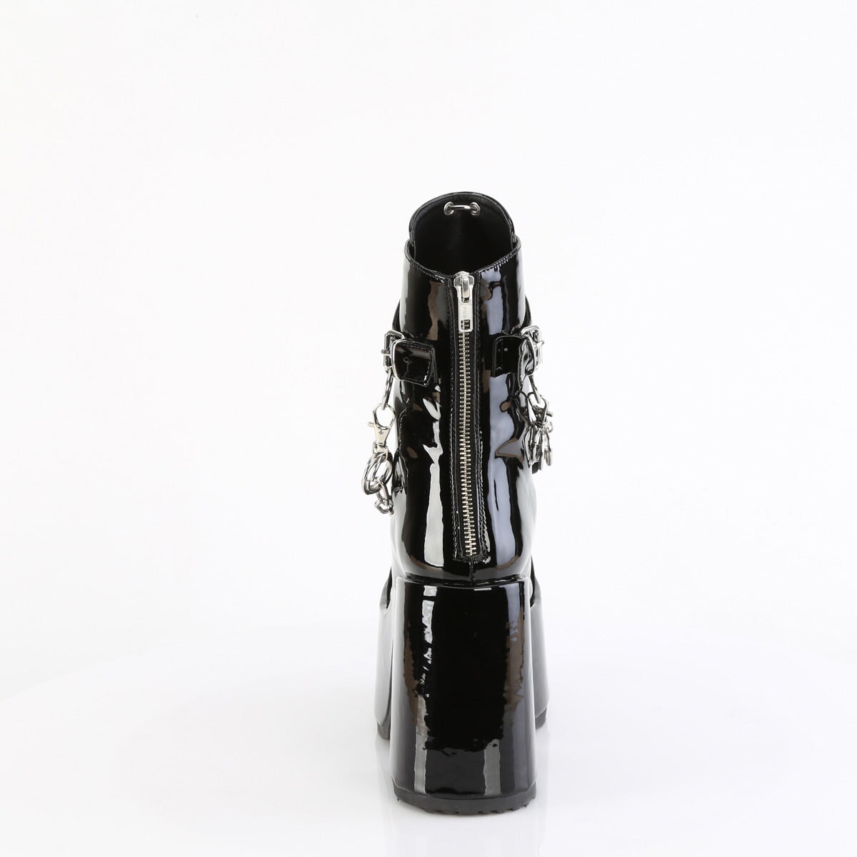 Laissez-vous tenter par une botte de style unique et élégant! Cette botte à talon épais de 5" (127 mm) et à plateforme de 3 po (76 mm) à mi-mollet avec boucle supérieure à boucle ronde cloutée avec joint torique, chaîne suspendue amovible et détails de joint torique sur la languette, fermeture à glissière en métal à l’arrière.