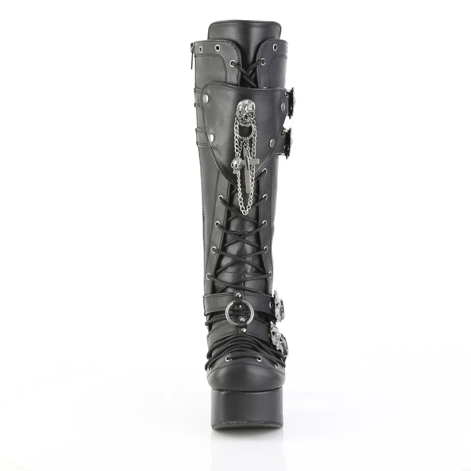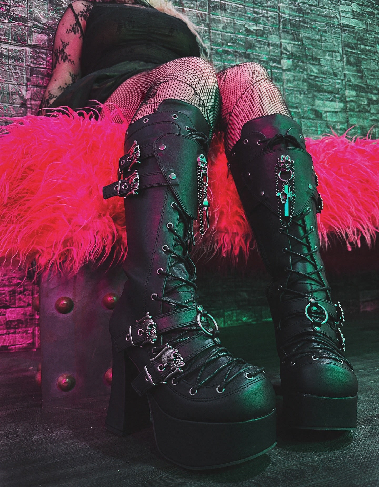 Dominez la scène avec ces bottes à talon bloc de 4 1/2 po (114 mm) et à plateforme de 2 po (51 mm) et à hauteur de genou. Orné d’un crâne en métal et d’un détail de chaîne suspendue sur un bouclier à boucle crâne, ainsi que de sangles à double boucle crâne pour un impact maximal.