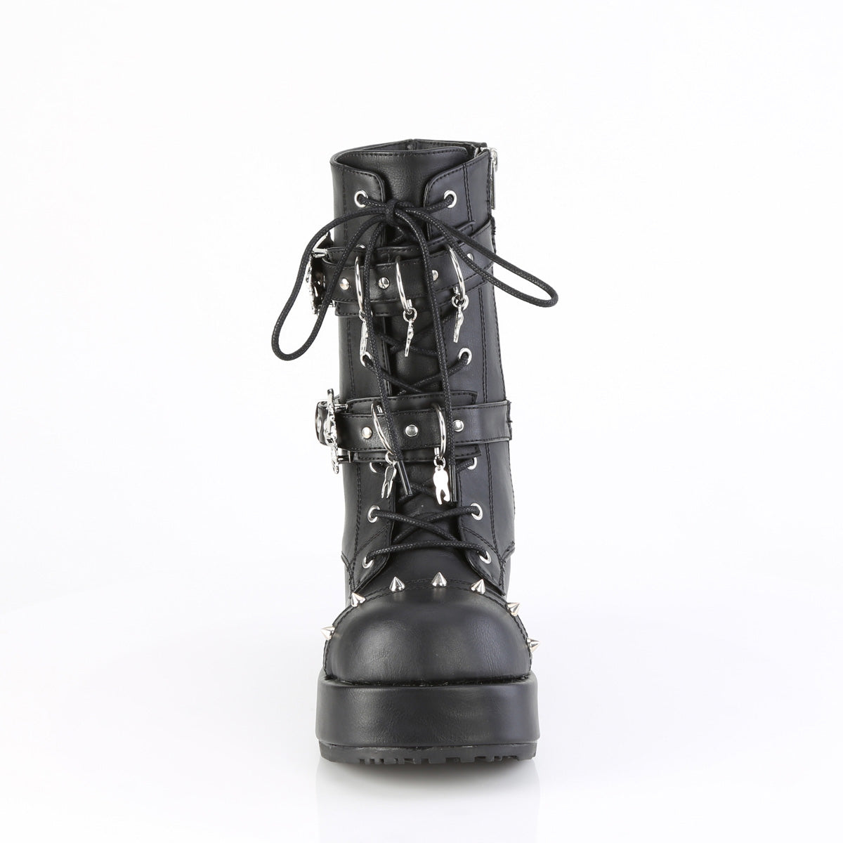 Adoptez un style confiant avec ces bottines à plateforme, dotées d’un talon de 2 3/4" (70 mm) et d’un laçage à l’avant pour un ajustement sécuritaire. Les doubles sangles à boucle en forme de crâne, l’anneau en D avec pendentif de dent, et les clous cônes à pointe sur le capuchon supérieur ajoutent une touche d’élégance rebelle, tandis que la fermeture éclair métallique intérieure assure un port facile.