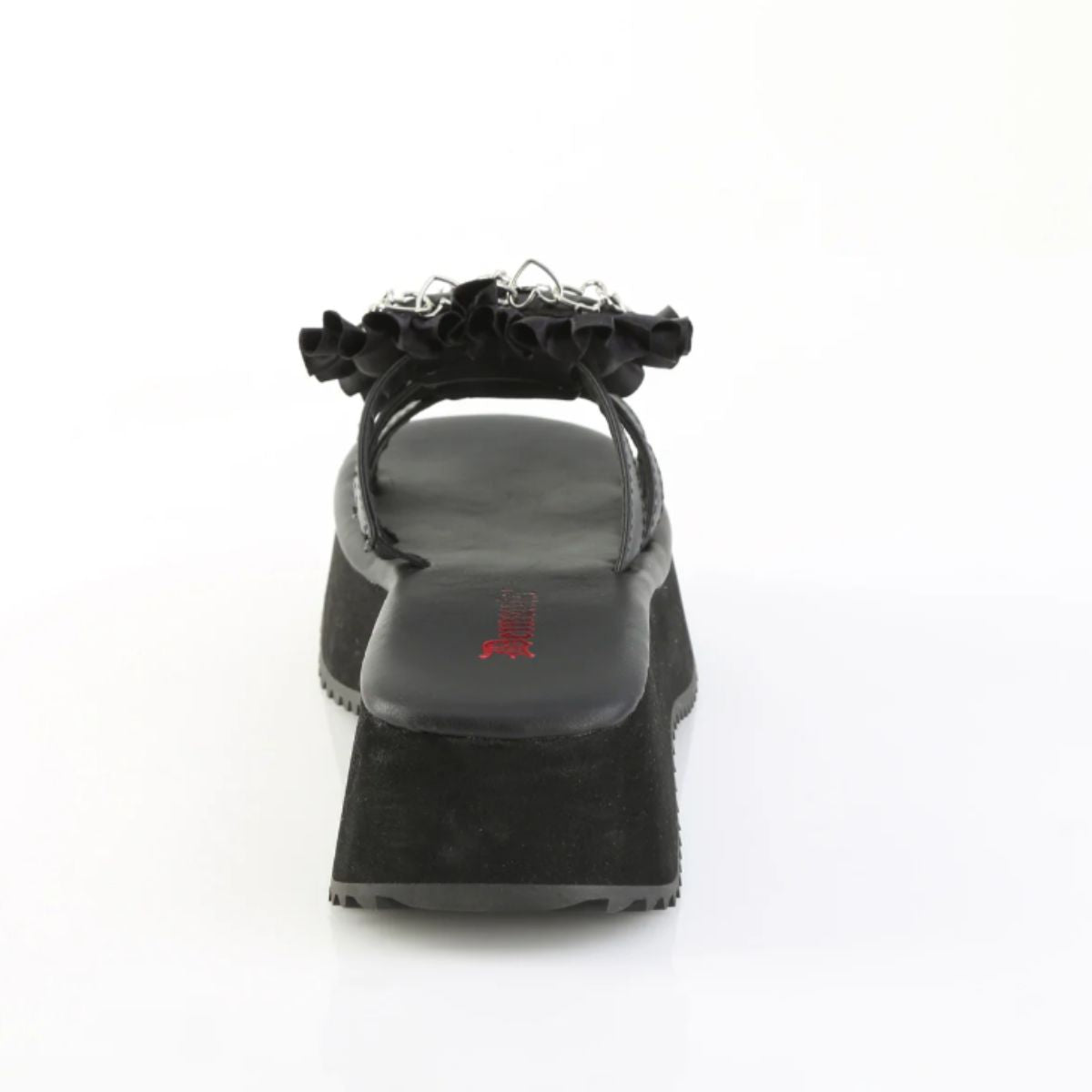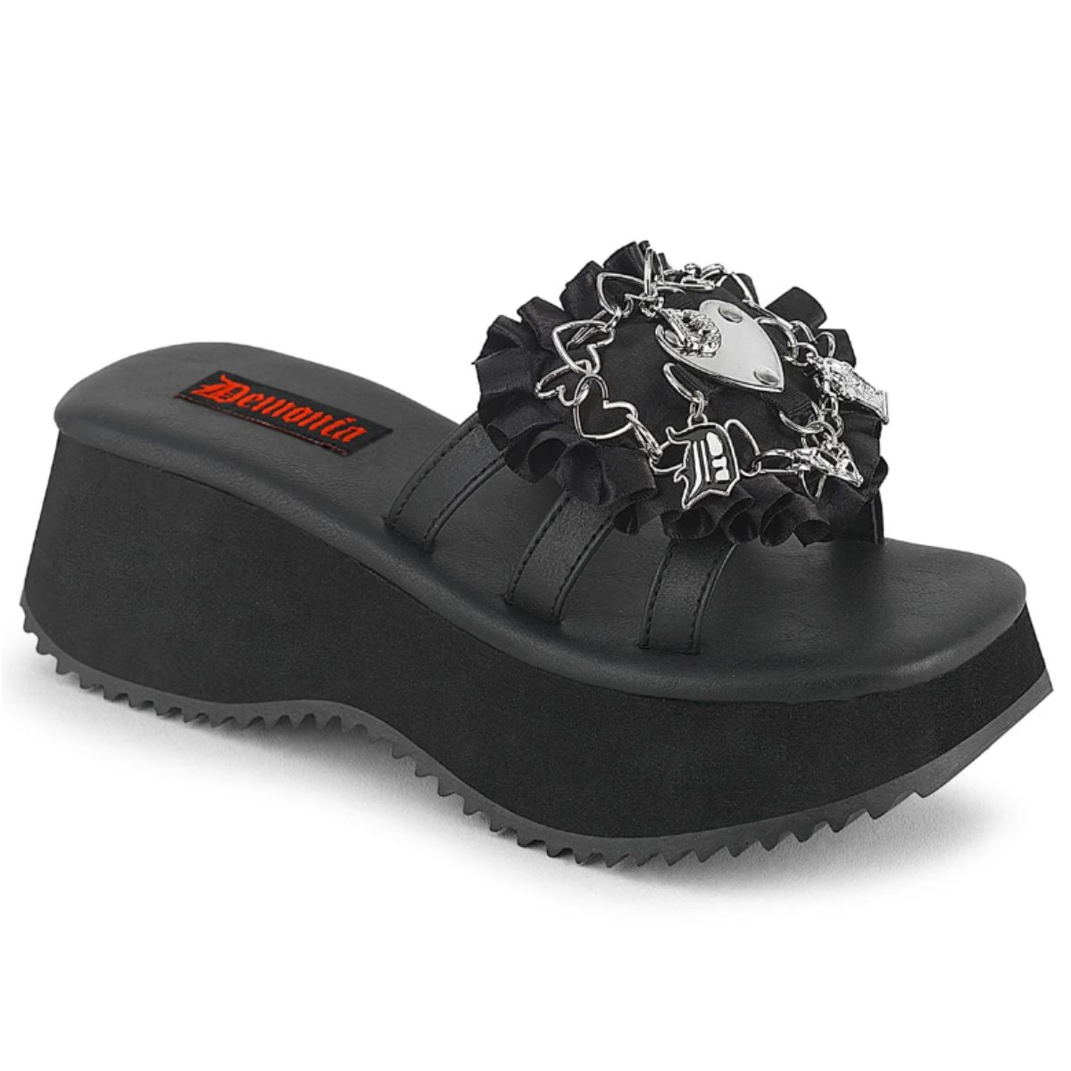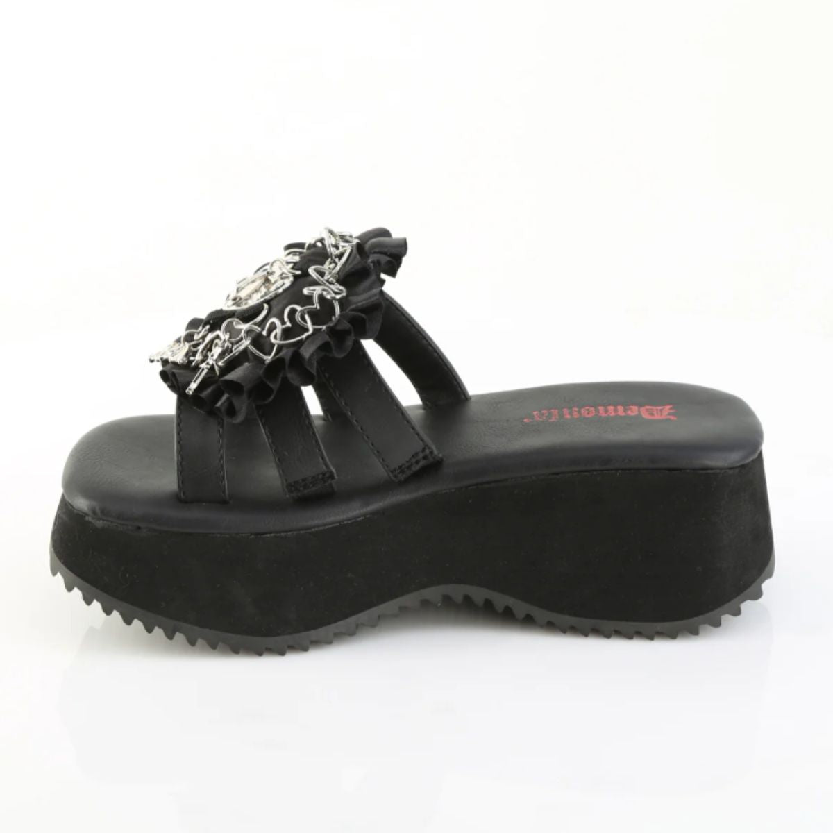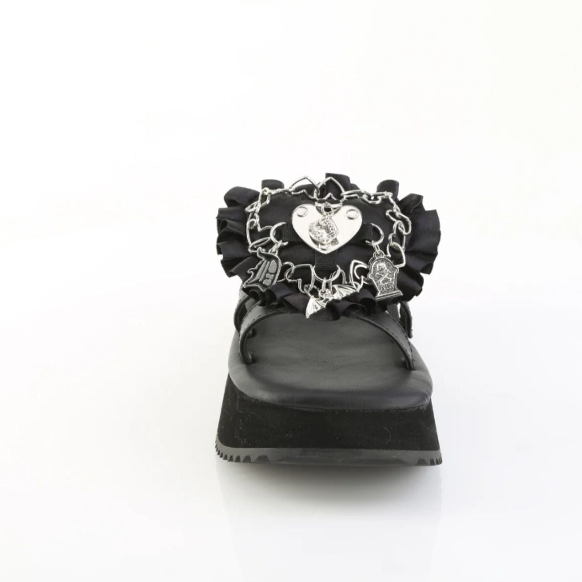 Cette sandale à glissière à trois bandes à plateforme de 2 1/2" (64 mm ) est dotée d’un coussin en forme de cœur froissé avec une bordure de chaîne en forme de cœur. Il possède aussi divers charmes et un centre métallique en forme de cœur pour une touche amusante et stylée.