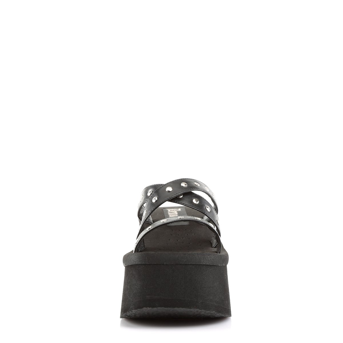 Plateforme en coin à bandes Slides avec des sangles cloutées argentées et un talon plateforme de 3 1/2". Cette glissière apparemment simple comporte beaucoup de montants métalliques pour un look audacieux et amusant.