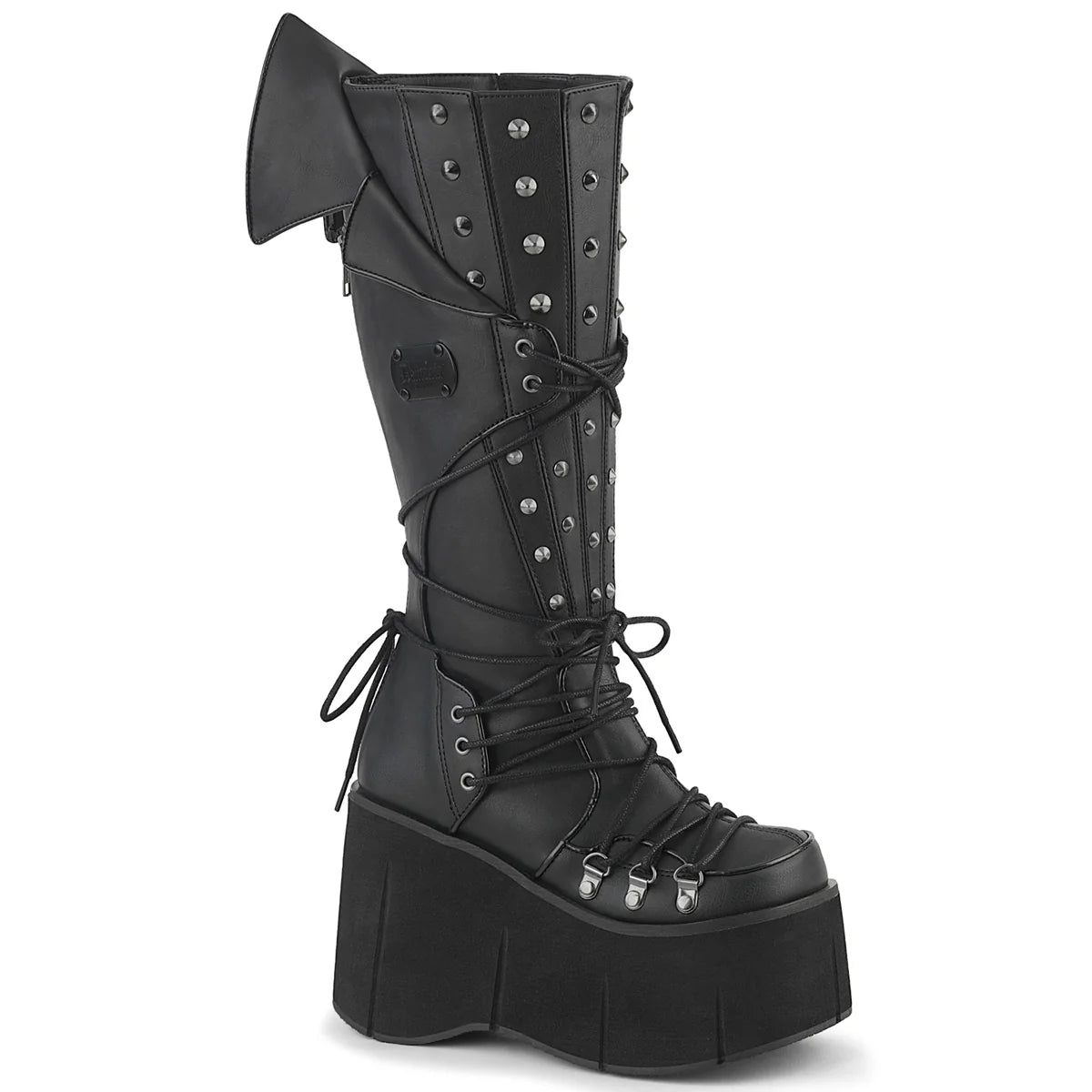 Écrasez chaque pas avec ces bottes audacieuses jusqu’aux genoux, construites sur une plateforme frappante de 4 1/2" (114 mm). Doté d’un laçage en D ornemental, de clous à pointes pour col et cône, d’un gousset stretch à l’avant pour le confort, et d’une fermeture éclair intérieure métallique pleine longueur pour un port facile.