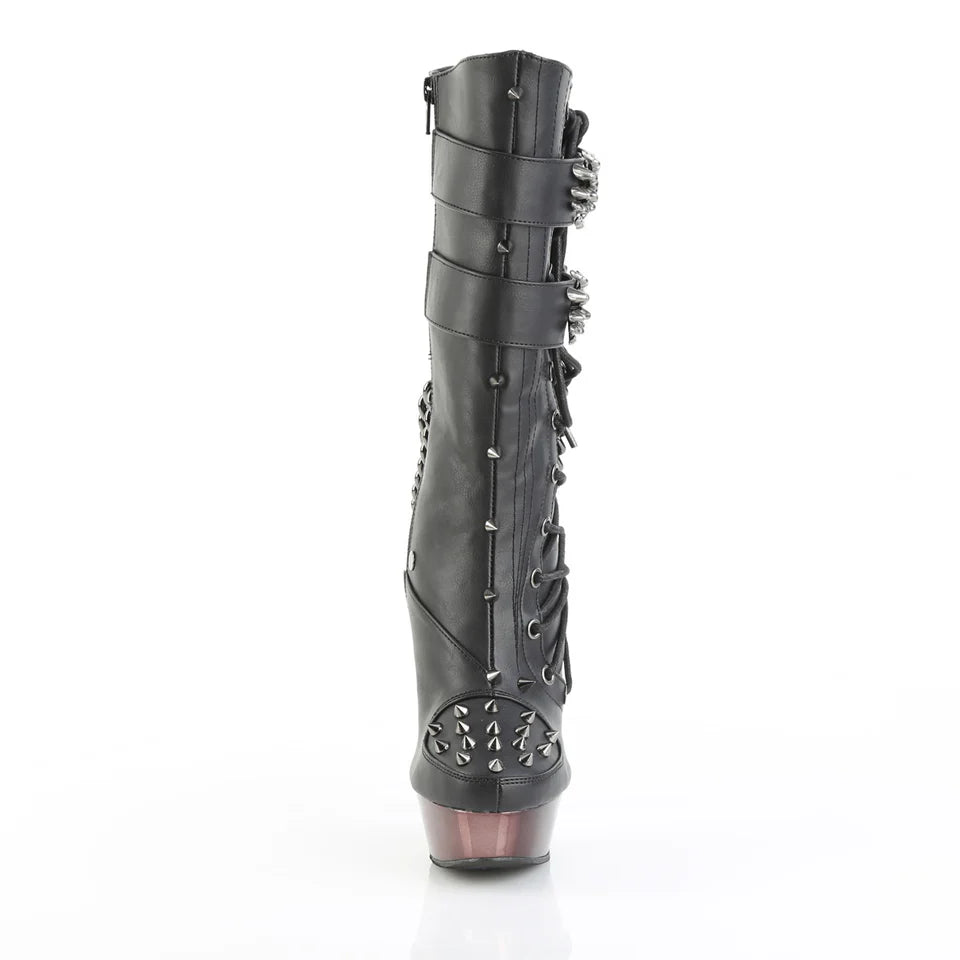 A mid-calf moto boot with a 5 1/2" (140mm) finger bone heel and a 1 1/2" (38mm) platform, featuring corset-style outer lacing, double skeleton hand buckle straps, spike stud details, double hanging chains, a pewter chrome plated bottom, and an inner side zip closure.