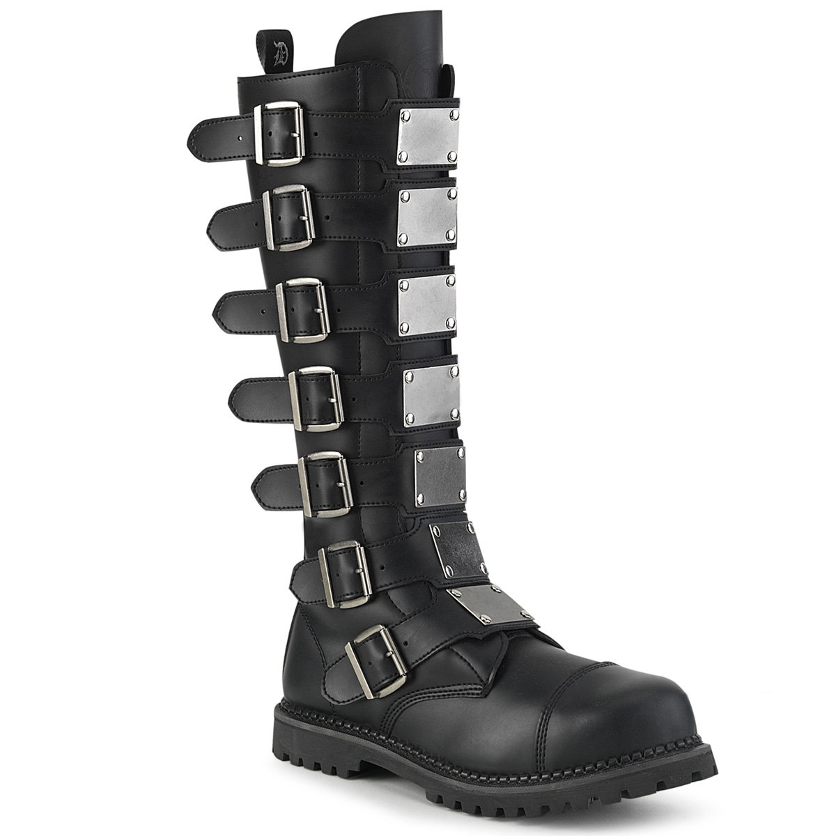 Demonia unisexe Végane Botte de combat au genou à bout en acier avec plusieurs boucles et plaques de métal à l’avant, semelle en caoutchouc et fermeture à glissière intérieure sur toute la longueur.
