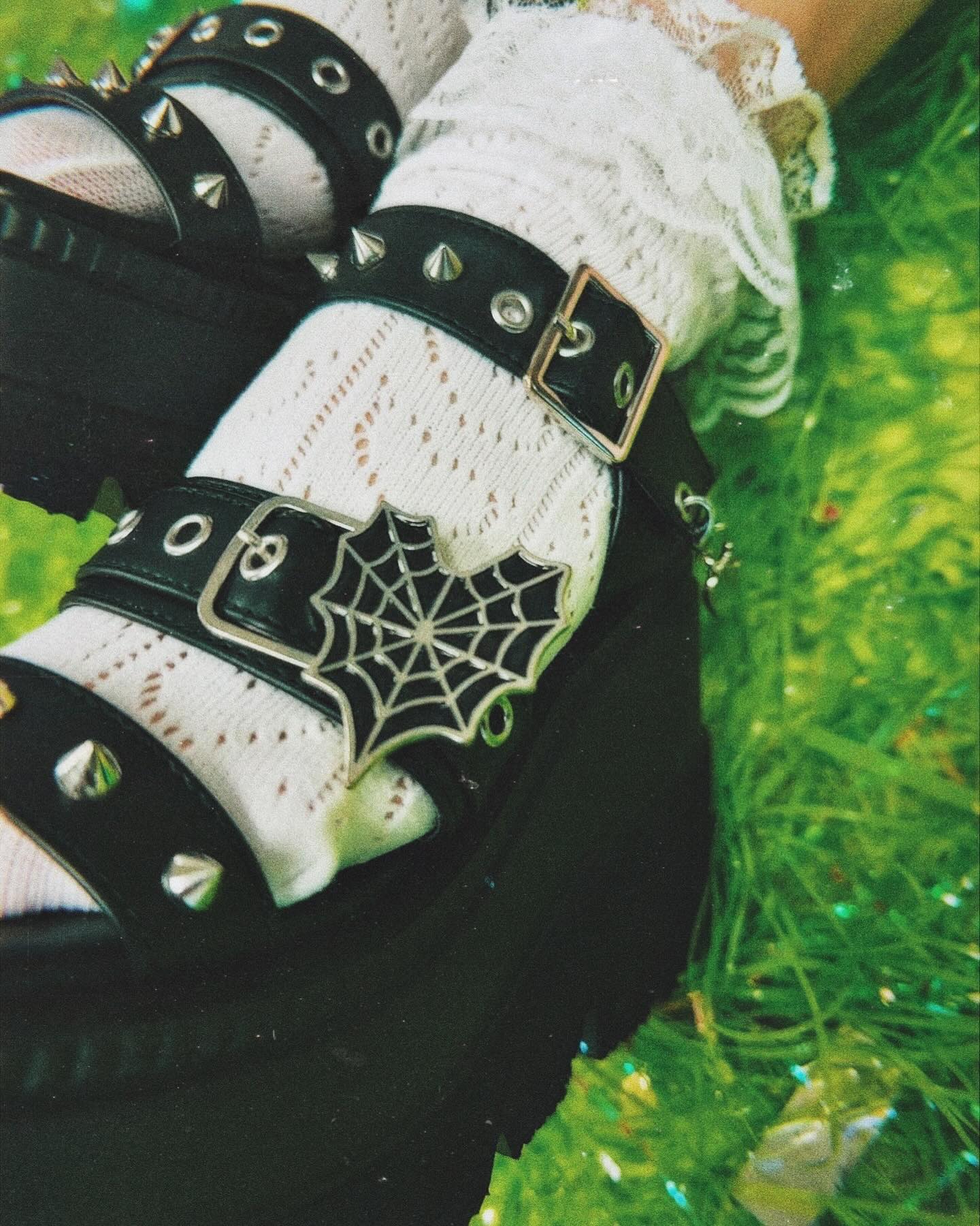 Mystérieusement effrayante d’une façon cool. Une sandale à plateforme compensée de 4 1/2" avec une lanière supérieure et inférieure cloutée en cône, une sangle centrale en forme de cœur, et Demonia Détail du charme 'D'.