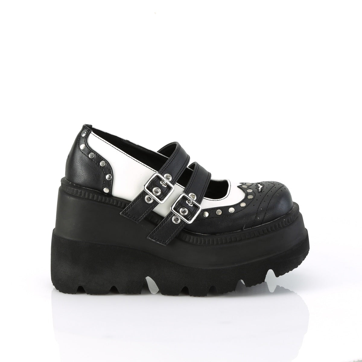 Élégante plate-forme compensée de 4 1/2 po (114 mm) à double boucle en bout d’aile Maryjane avec empeigne et talon ronds plats et cloutés de couleur argentée.