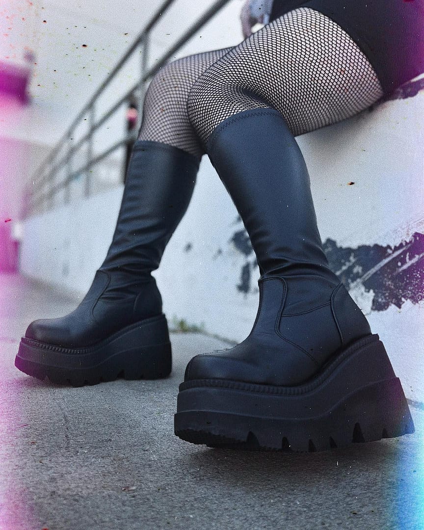 Plateforme compensée élégante et classique de 4 1/2" (114 mm) Mollet large Botte montante, fermeture éclair métallique à l’arrière sur toute la longueur.