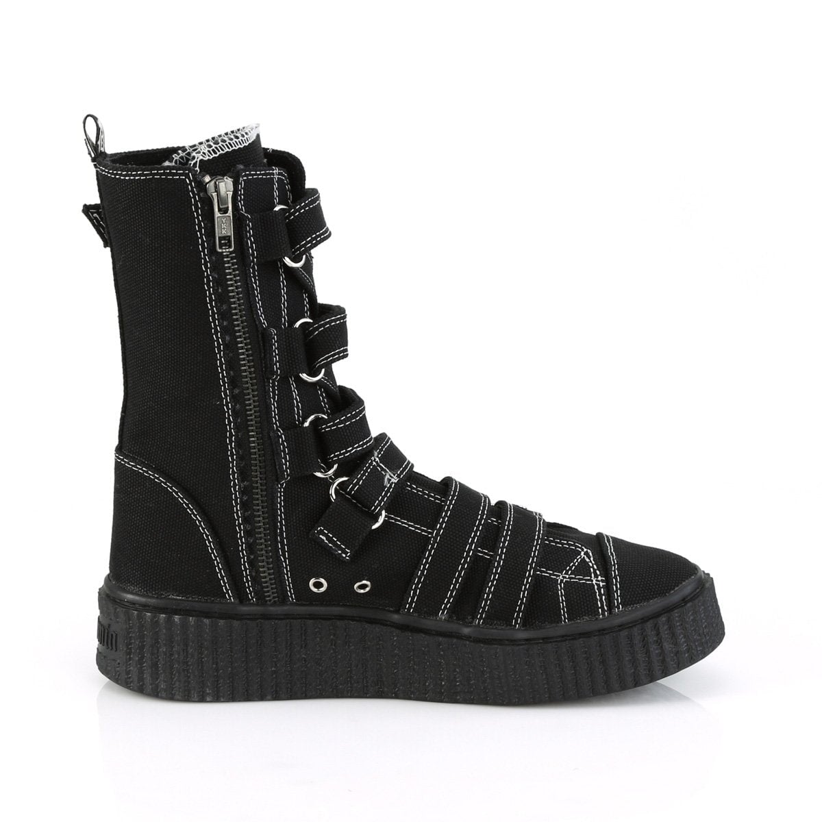Botte de basket en caoutchouc à plateforme lisse de 1 1/2 po (38 mm) à bout rond à mi-mollet avec sangles à boucle en zigzag à l’avant, fermeture à glissière en métal entièrement intérieure.