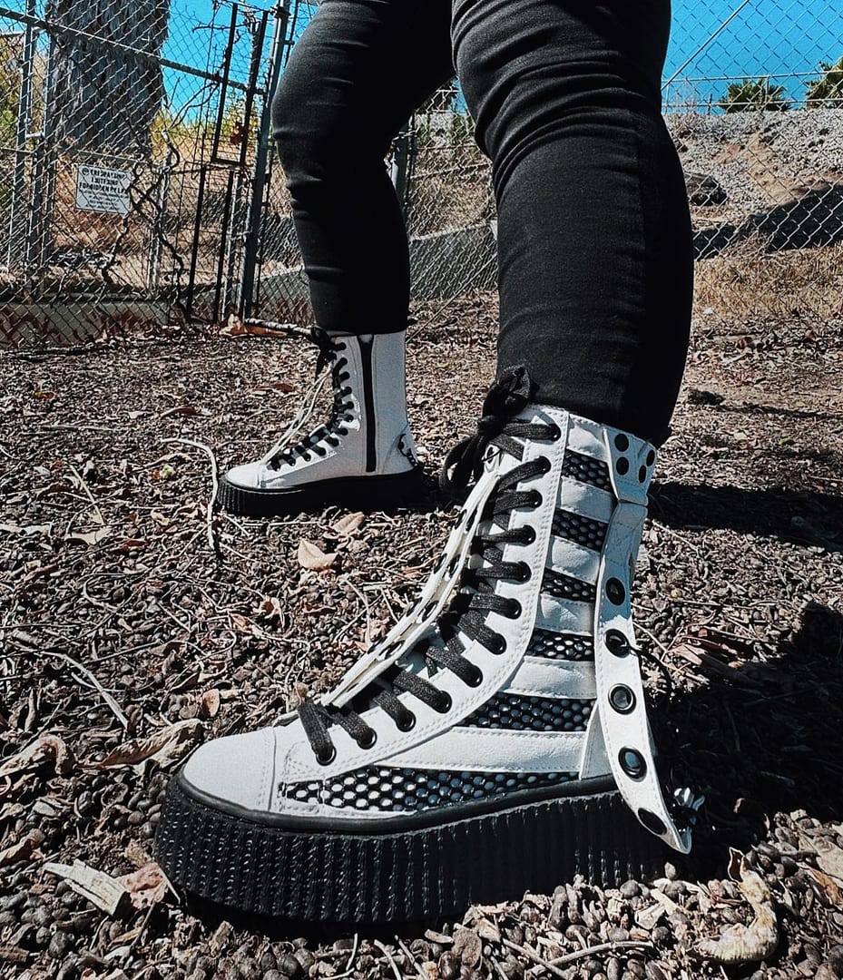 Voici ces bottes sophistiquées creeper creeper à mi-mollet, équipées d’une semelle en caoutchouc plateforme de 1 1/2" (38 mm) et d’un design à bout rond pour un parfait équilibre entre style et confort. Les panneaux latéraux contrastés épurés et les détails rivetés de la sangle et de la chaîne ajoutent une touche de modernité, tandis que la fermeture éclair intérieure métallique complète assure une facilité de port