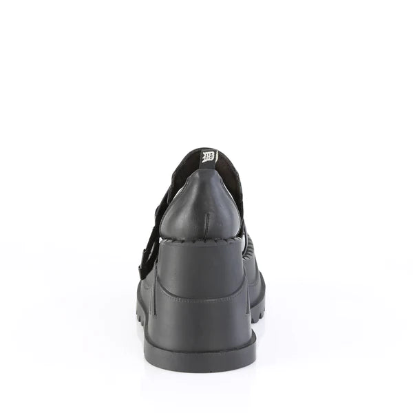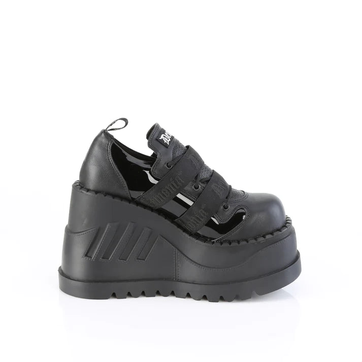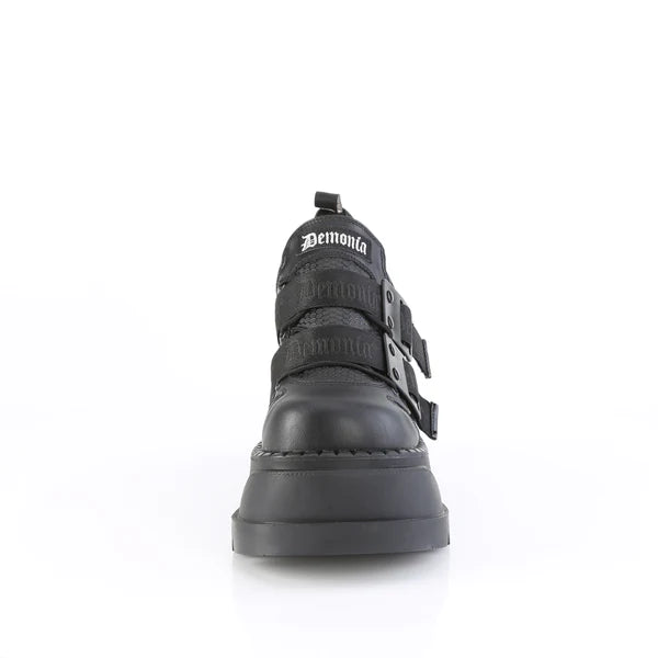Atteignez le style et le confort avec ces chaussures à lacets à plateforme compensée de 4 3/4 pouces. Elles sont équipées de cheville et de languette rembourrées pour un ajustement confortable etDemoniaDes sangles en nylon à crochet et boucles de marque avec des détails en plaques métalliques, faisant une déclaration de mode audacieuse.